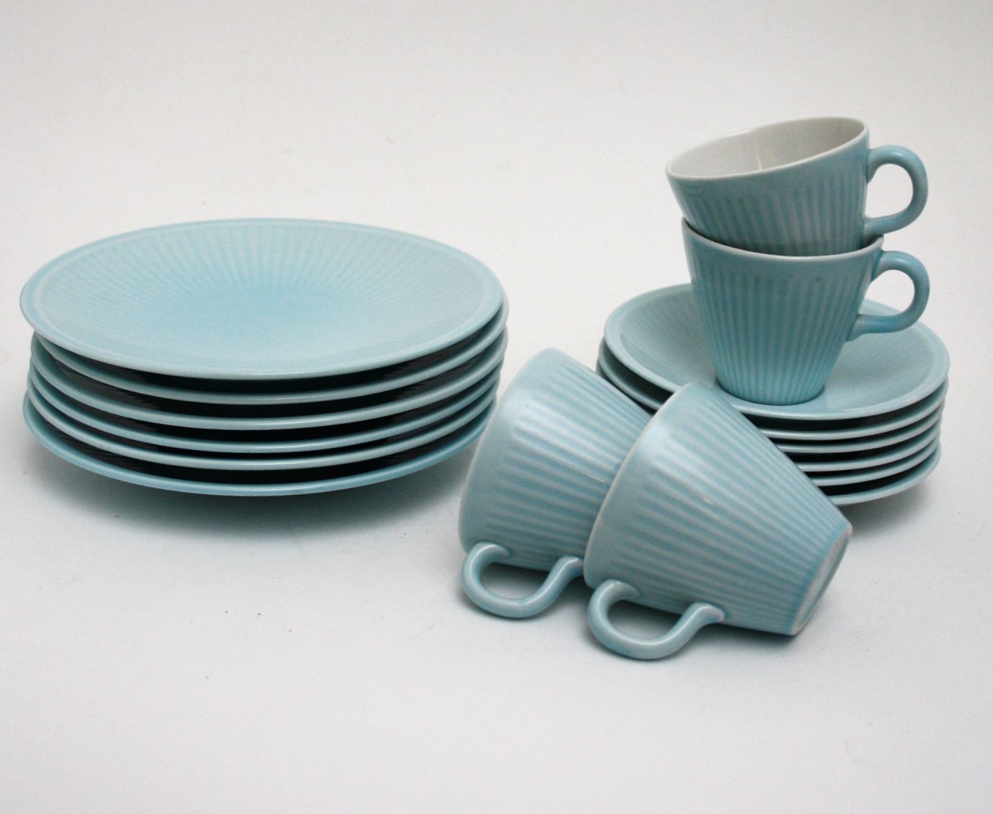 Rørstrand, Sweden, Lys blå mint rillet porcelæn kaffeservice fra 1950'erne, antagelig restaurantstel i pastelfarver. Flot stand.