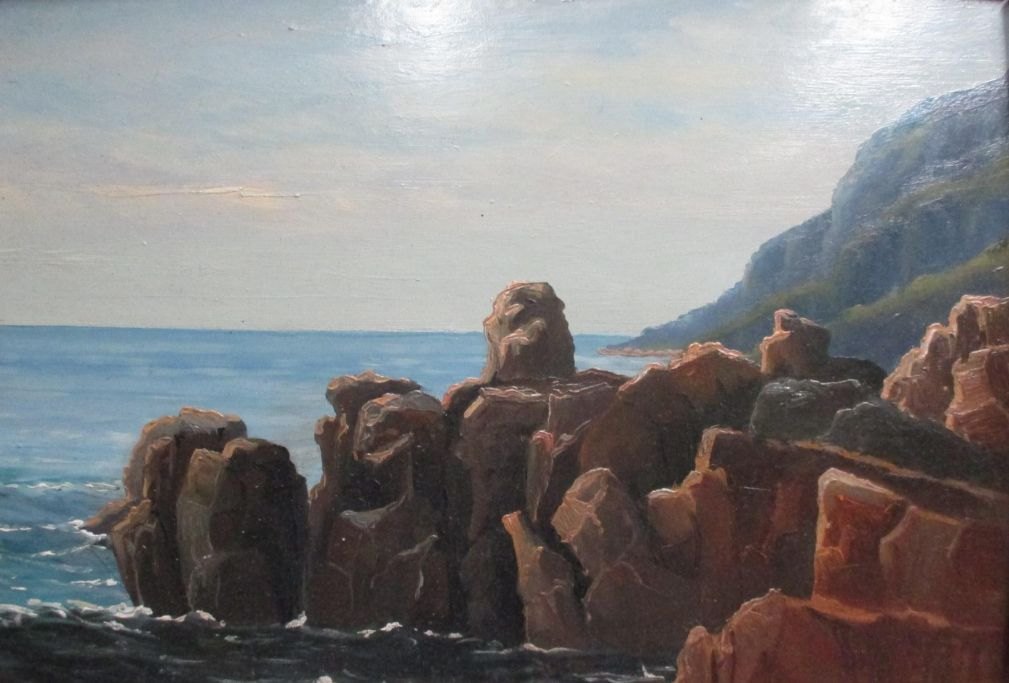 Grenness, Johannes (1875 - 1933) Norge/Danmark: Klippekyst. Olie på masonit. Signeret.: Monogram J.G. 28 x 41 cm.