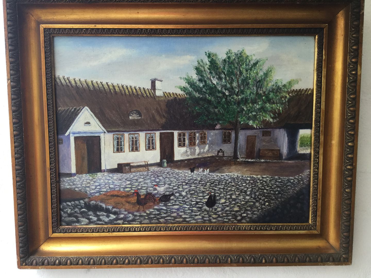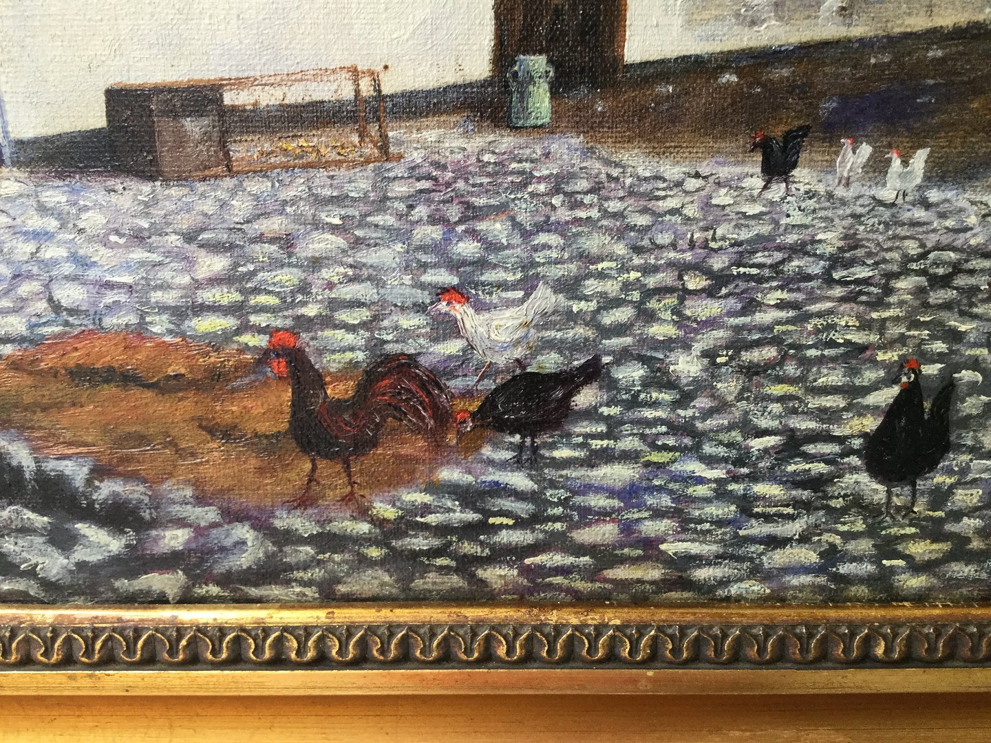 Maleri - Gårdeksteriør med høns.