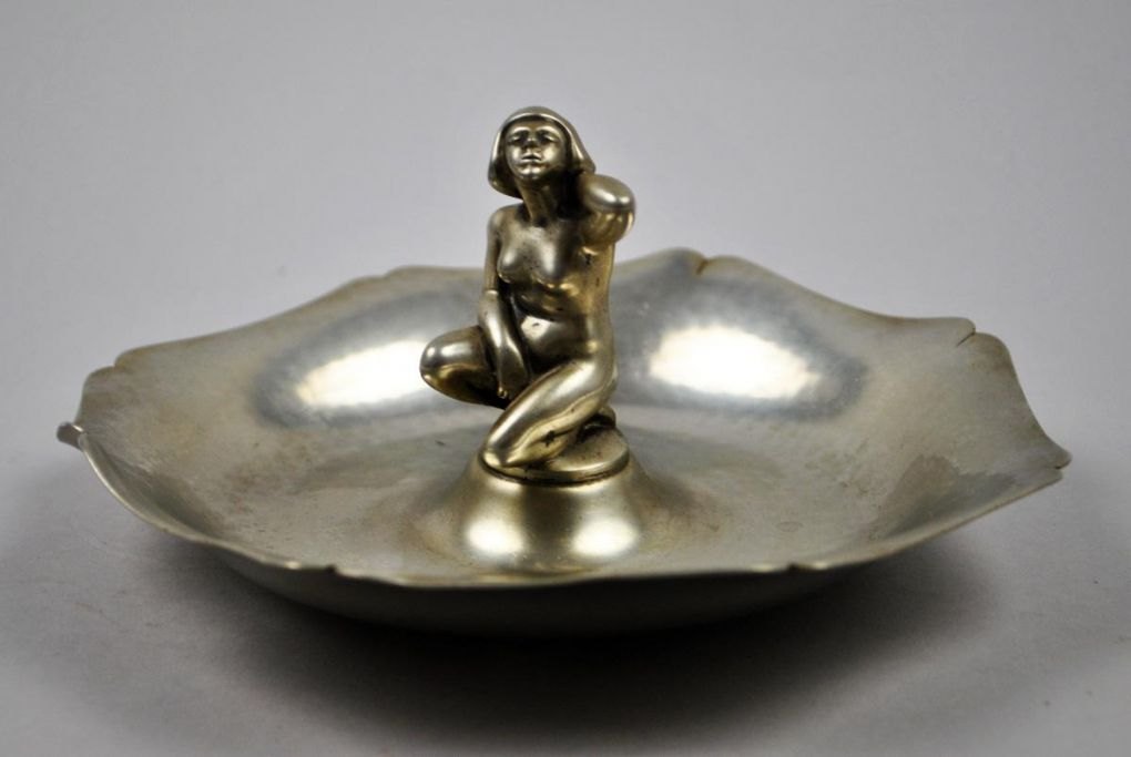Backhaus skål i hamret tin med siddende nøgen kvinde, 20. årh. Danmark