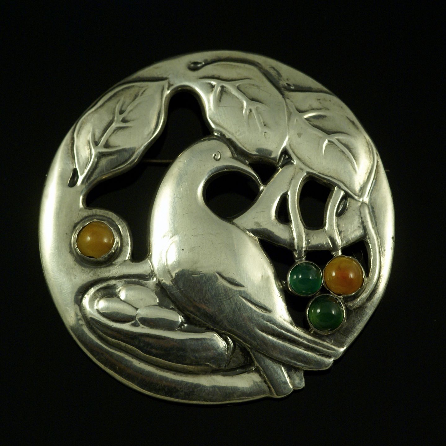 Thyra Vieth. Skønvirke Broche i Sølv med rav og grøn agat.
