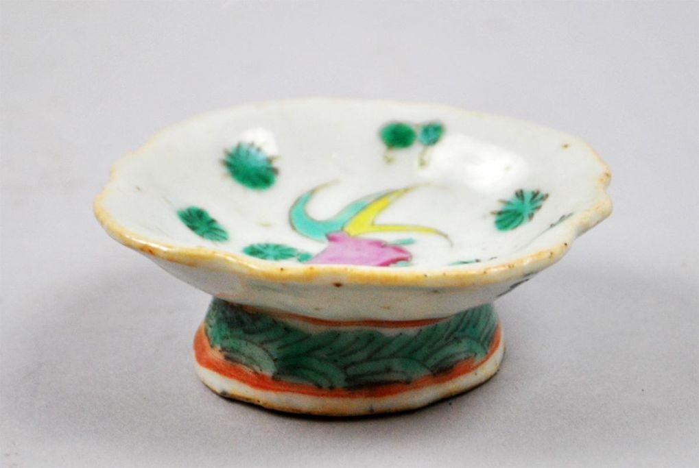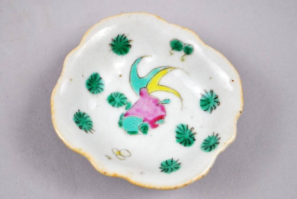 Chinese porcelain bowl. Famille rose. 19th century. Polycrom decoration with goldfish. H: 3, Dia .: 7 cm.