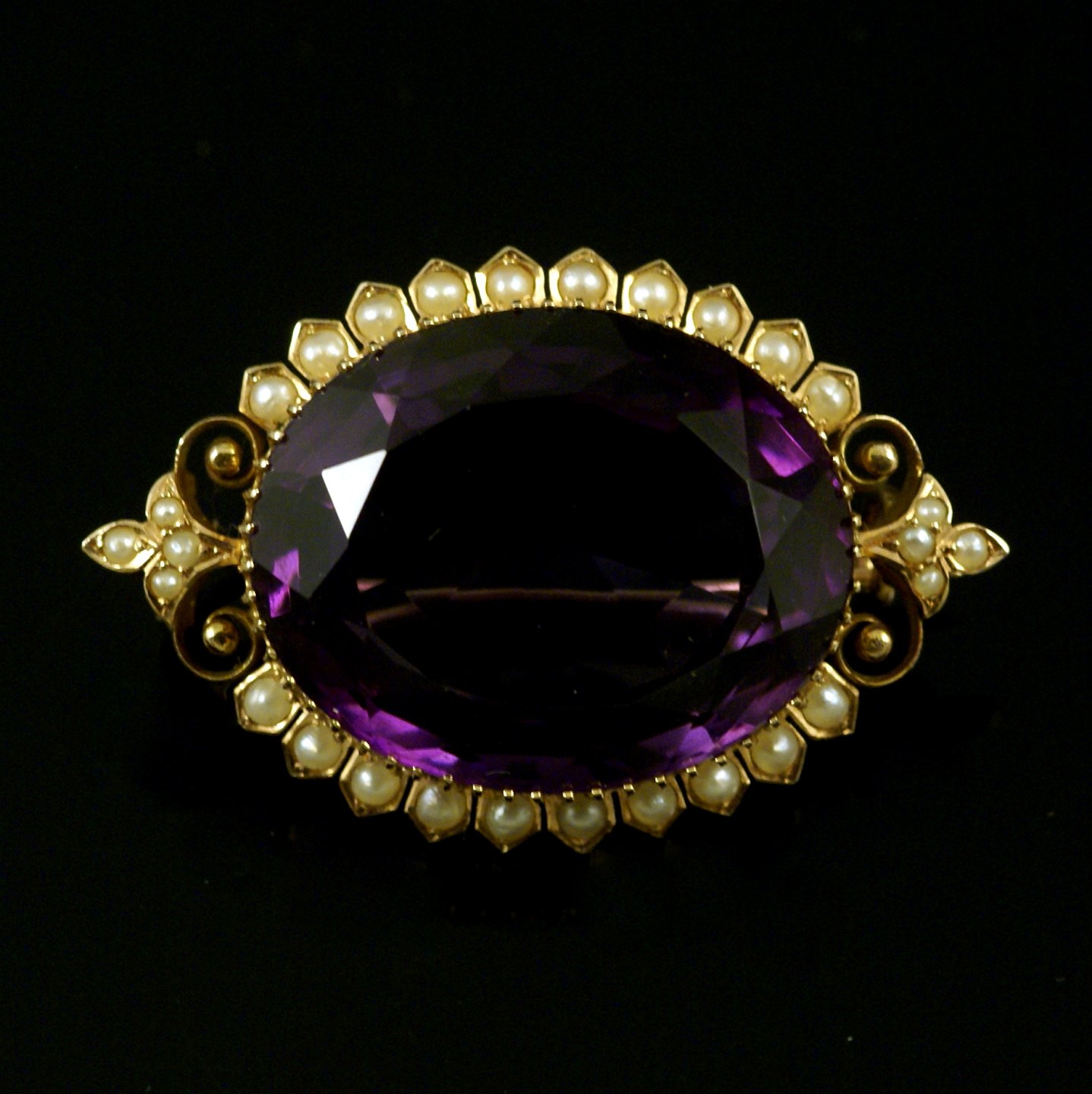 Vintage broche i 14k guld med orientalske perler og facetslebet ametyst