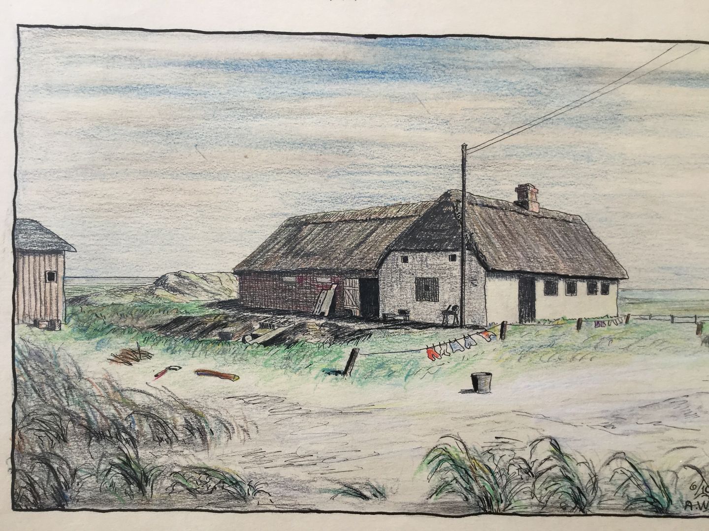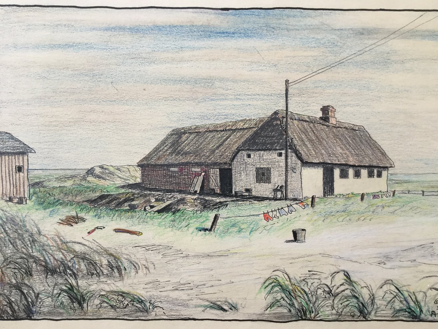 Text available in Danish: Tegning af A. Weber 1929 - Fiskerhus ved kysten.