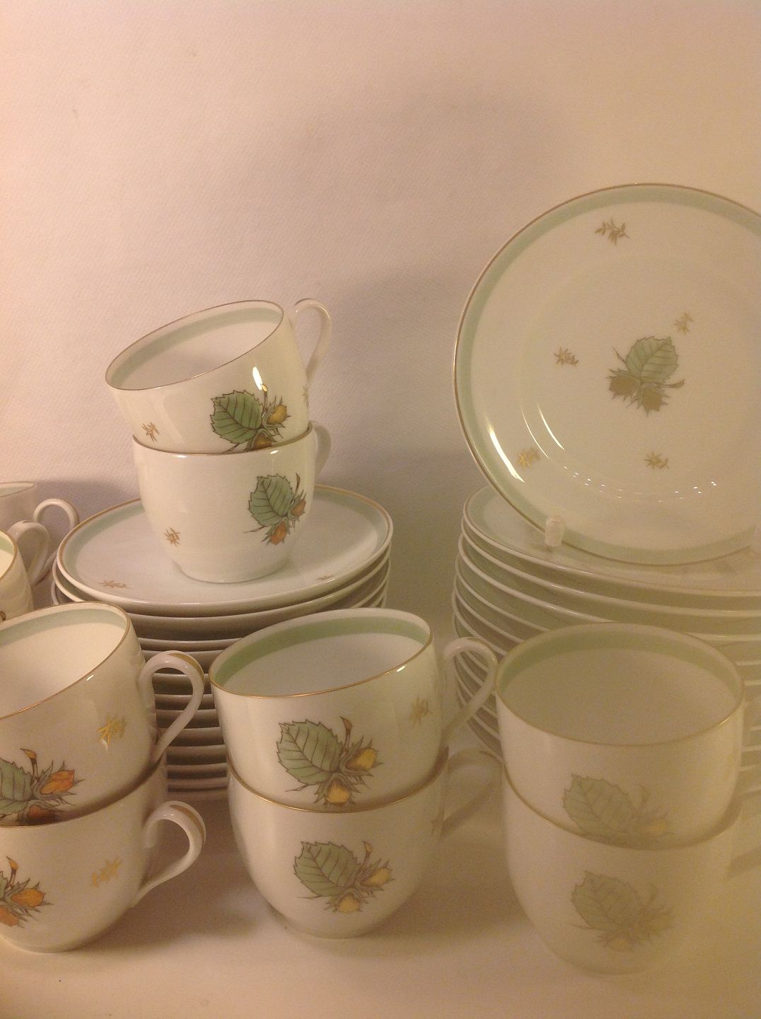 Cup and saucer 1,25 dlB & G nr 305) Hasselnød Bing & Grondahl B & G, White porcelain with hazelnuts in gold, green leaves, green ribbon and gold edge.