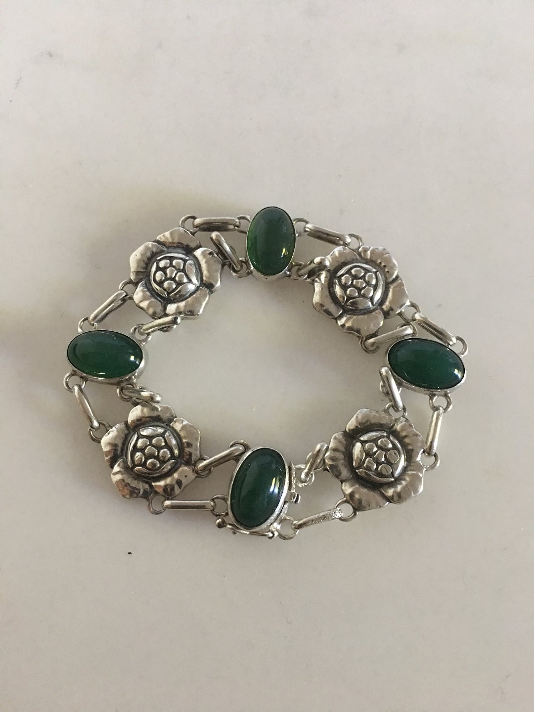 Georg Jensen Sølv Armbånd No 12 med Grønne Agater. Lavet omkring 1919 - ca 1927. Måler 19,5 cm x 1,8 cm bredt. Vejer 23 gram.
