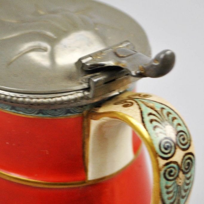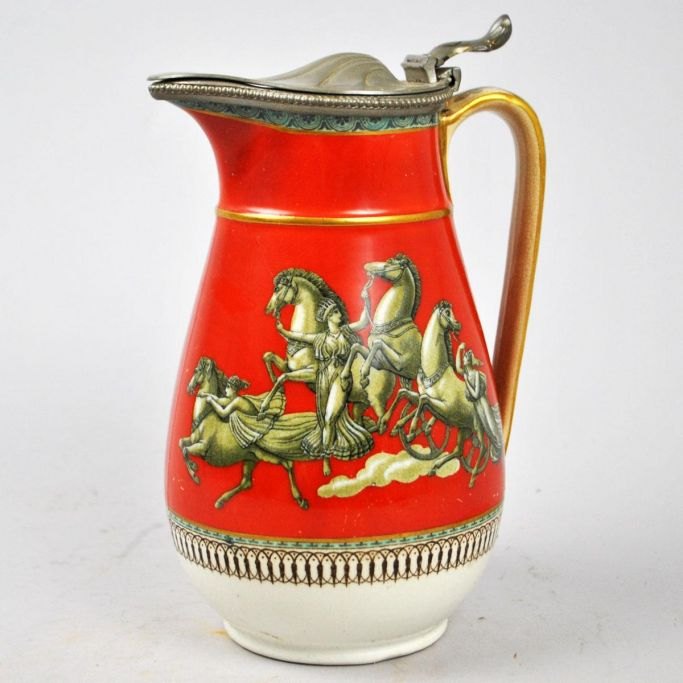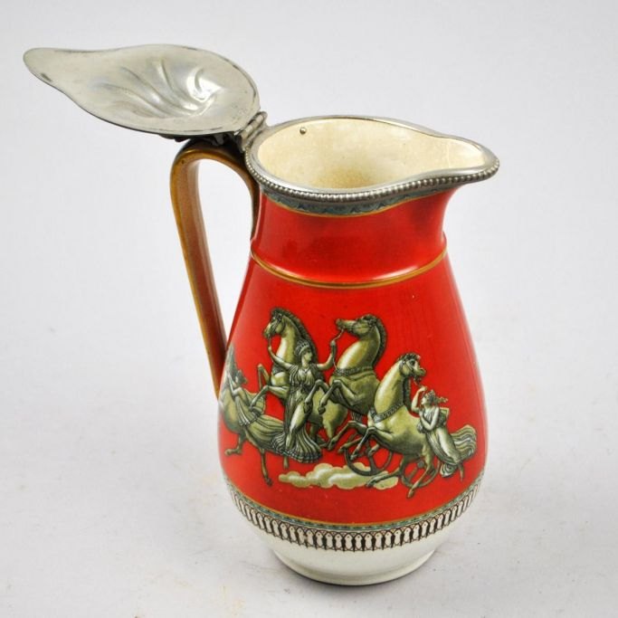 Engelsk fajance kande med tinlåg. 19. årh. Dekoreret med klassisk motiv i overføringsteknik. Stamplet. H.: 19 cm.