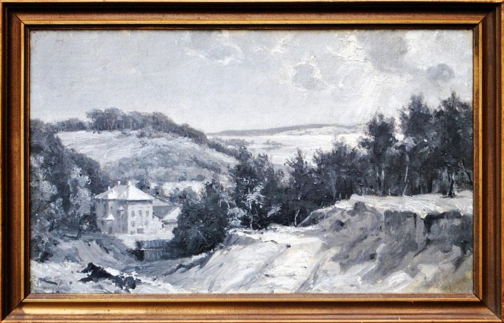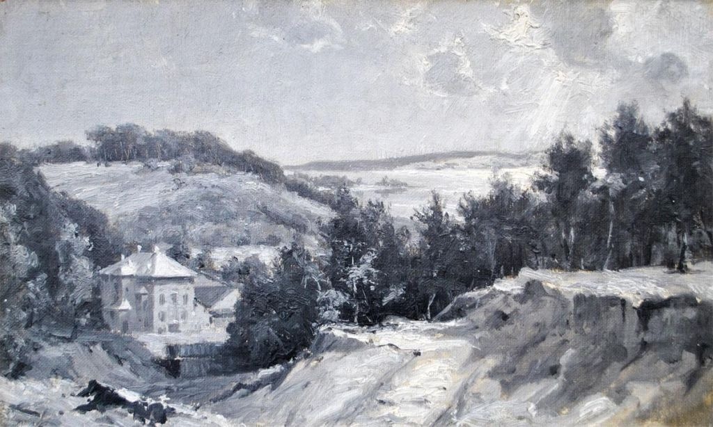 Soya-Jensen, Carl Martin, (1860-1912), Denmark: Landscape. Grisailles. Signed on the backside: Soya - Jensen. 20 x 33 cm.