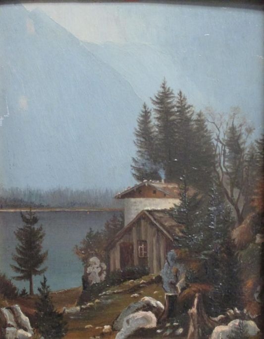Kiærschou, Frederik Christian (1805 - 1891) Danmark: Tåget efterårsdag fra Hintersee, Berchtesgaten, Bayern. Olie på træ. Betegnet på bagsiden. 23,5 x 18 cm.