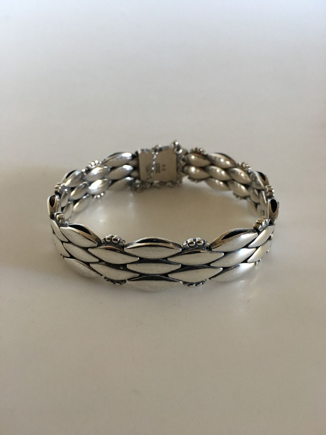 Georg Jensen Sterling Sølv Armbånd No 86. Med sikkerhedskæde. Designet af Harald Nielsen. Måler 19 cm x 1,3 cm bredt. Vejer 40 g. Fra efter 1945.