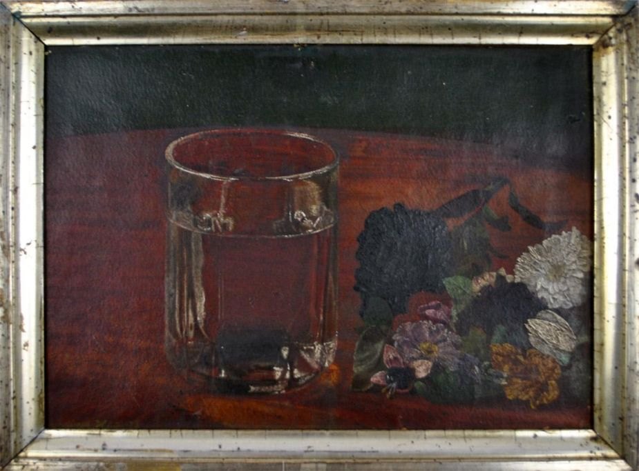 Huus, Eduard 19. årh. (Danmark): Opstilling med blomster og vandglas. Olie på pap. Signeret.: Eduard Huss 78. 18 x 25 cm.