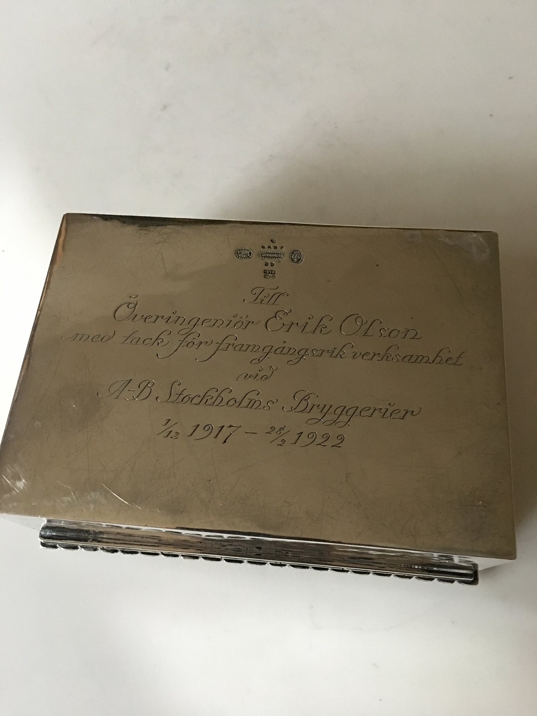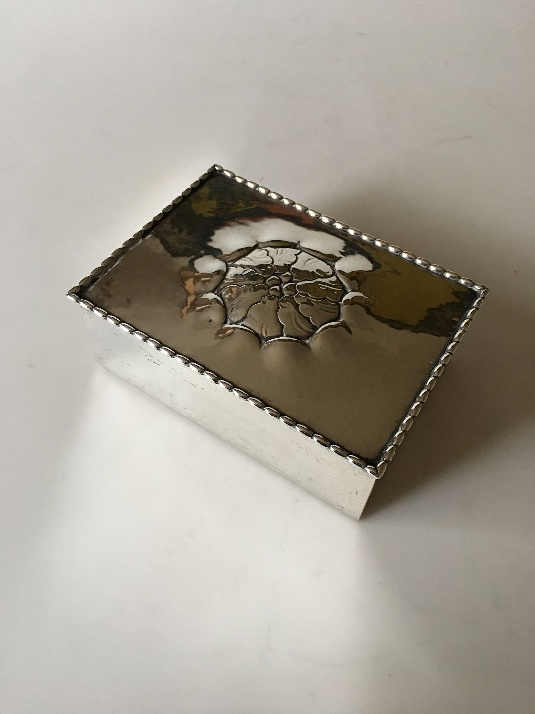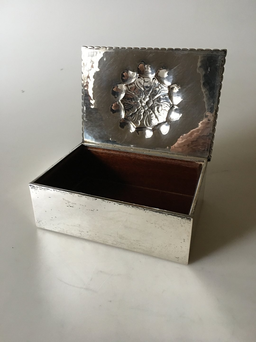 Georg Jensen Boks No. 89 i 830 S fra 1919. Måler 13.5 x 10 cm. 4.5 cm. Beklædt med indvendig træbeklædning. Vejer 343 gram. Med inskription underneden.
