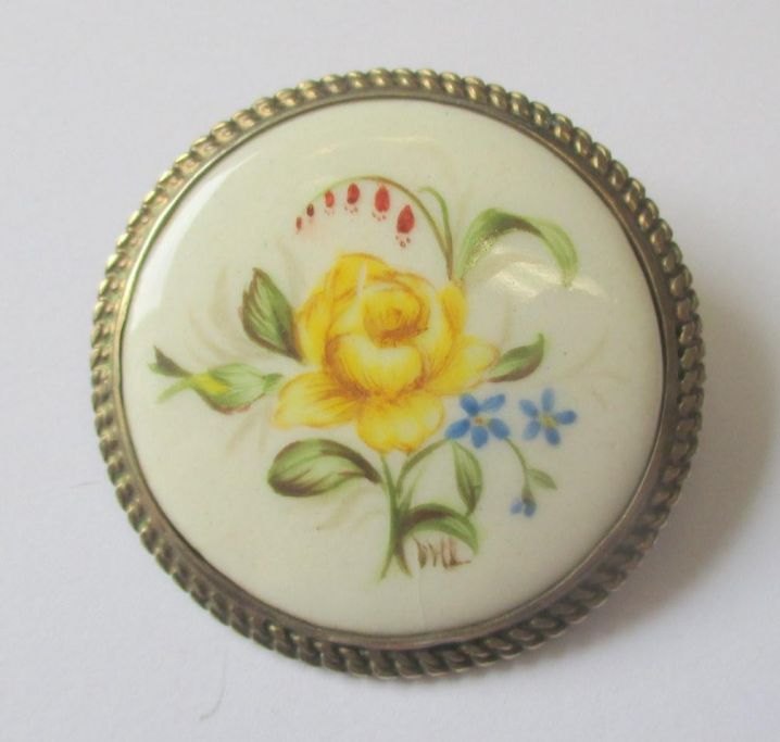 Sølv brosche, A. F. Rasmussen, Aarhus, Danmark, 20. årh. Med håndmalet palquette med blomster. Dia.: 4,1 cm. Stemplet.