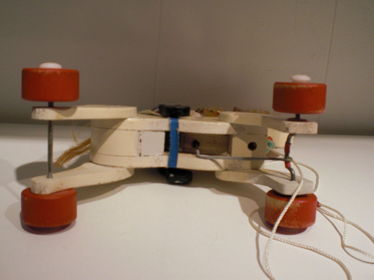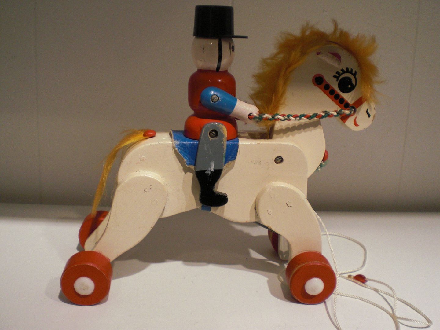 Bemalet træhest med rytter. Når legetøjet trækkes bevæger hesten hovedet og rytteren hopper lidt i sadlen. Ukendt producent. Fin stand med tidstypisk slid. Ca. 1950. Længde: 24,5 cm. Højde: 21,8 cm