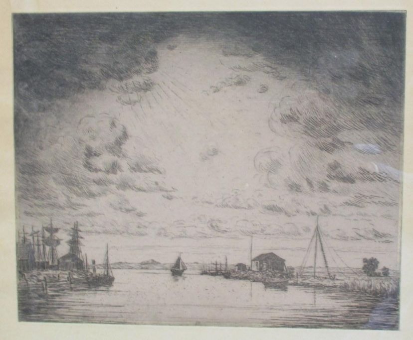 Rohde, Johan (1856 - 1935) Danmark: Et havne indløb. Radering. Signeret. 25 x 30,5 cm.