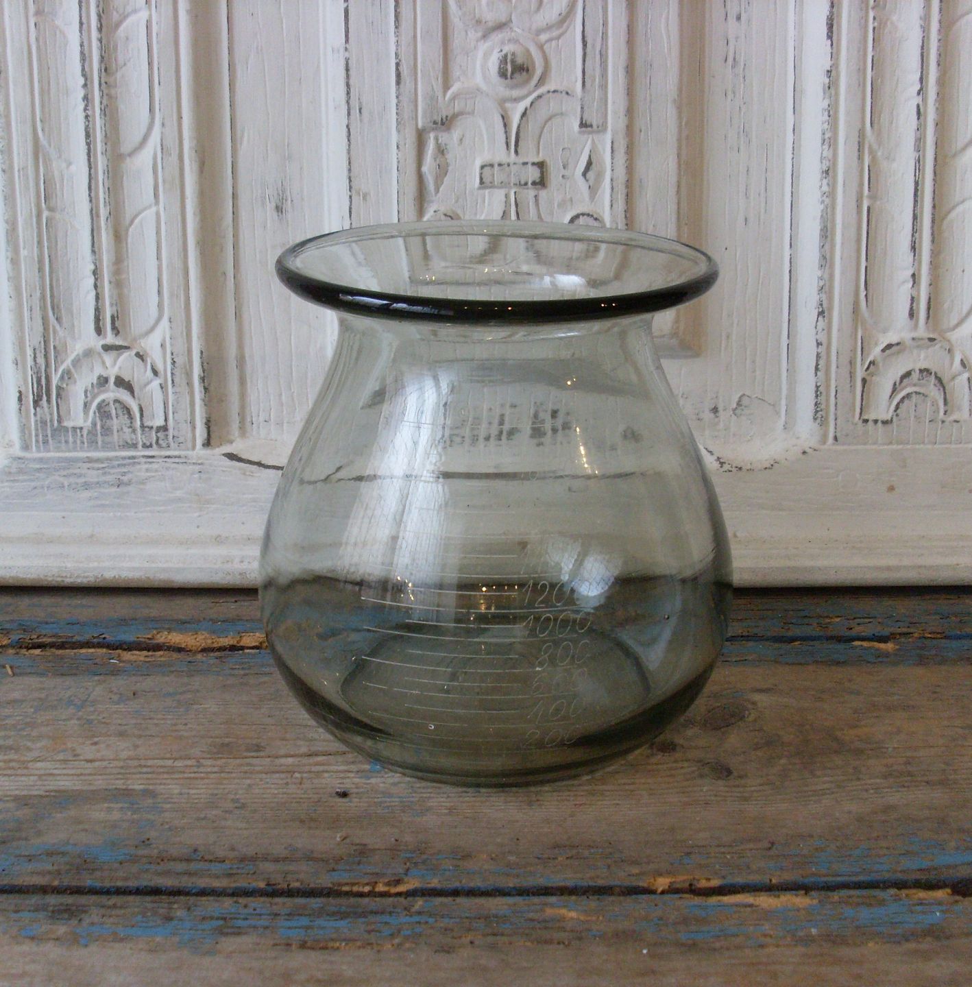 Gammelt mundblæst apoteker glas, påmalet måleenheder.