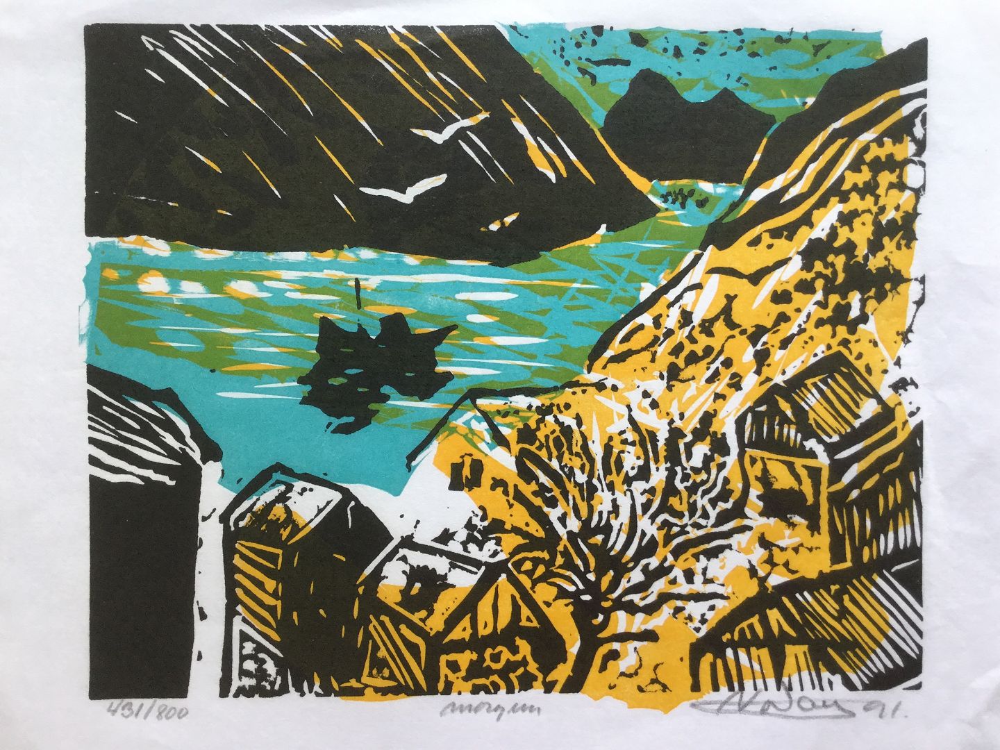 Farvetræsnit af Amariel Nordoy 1991 - Færøsk fjordparti.