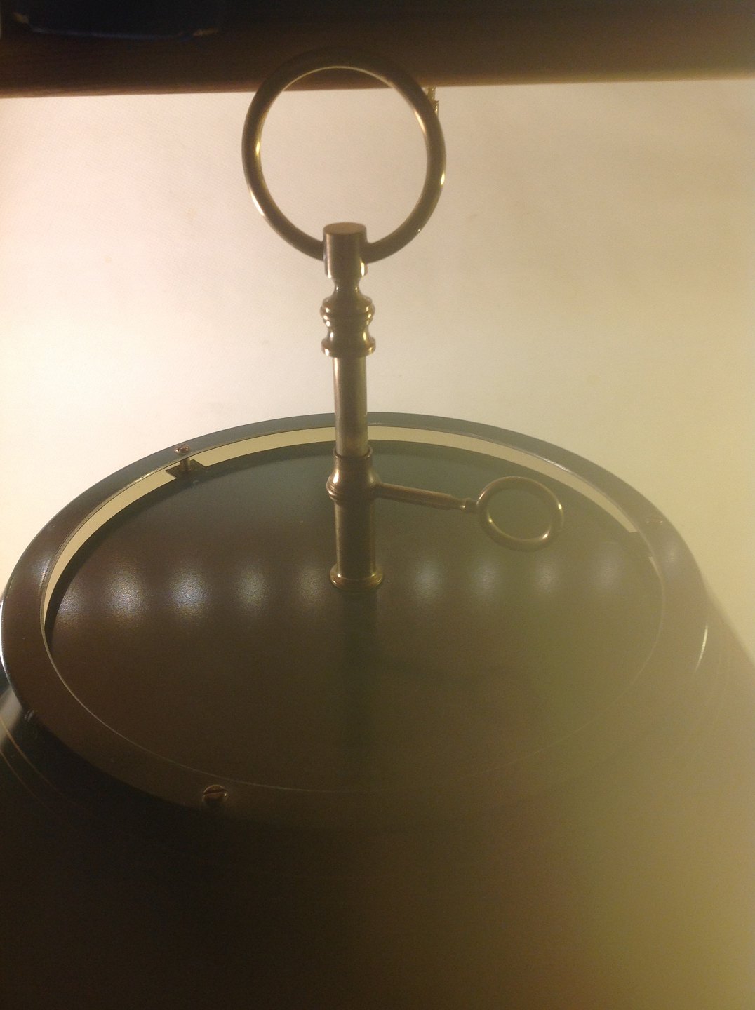 Bordlampe med grøn metalskærm som kan reguleres i højden.