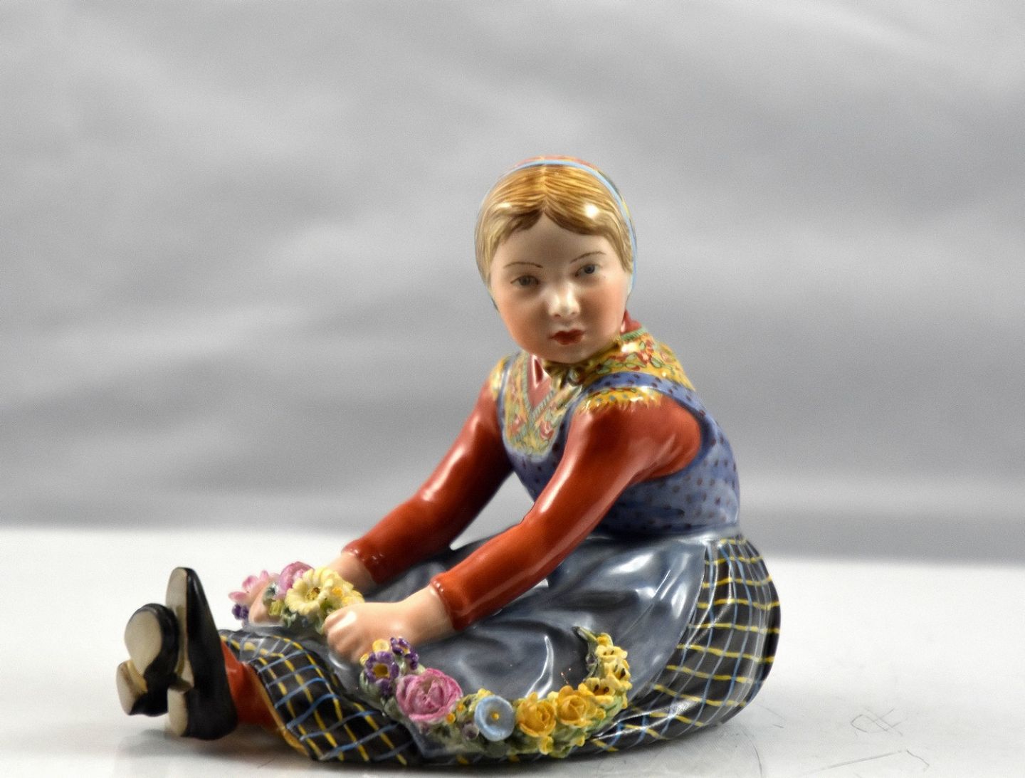 Siddende pige i egnsdragt fra Jylland, sidder med blomster i hænderne, overglasseret