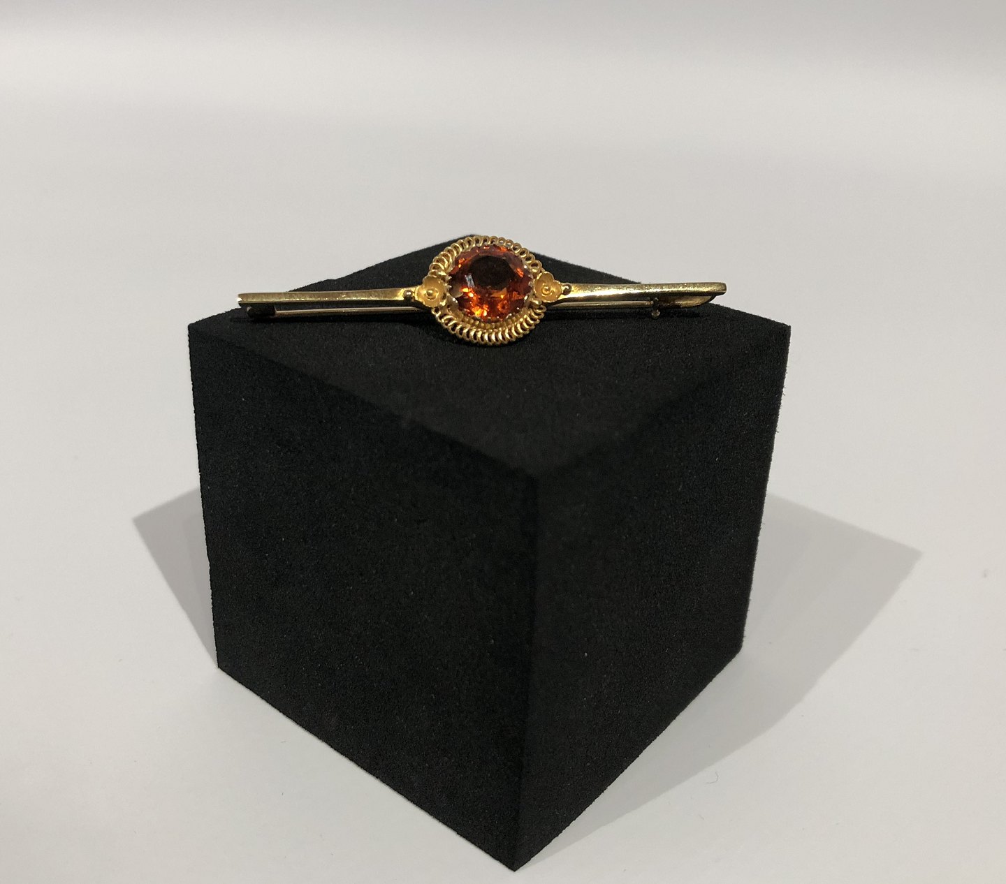 Broche i 14 kt. guld med flot ravfarvet sten.