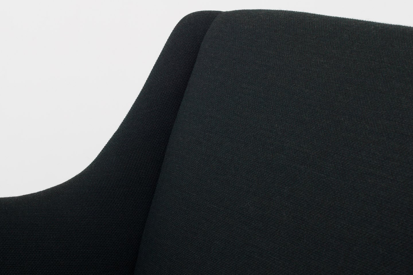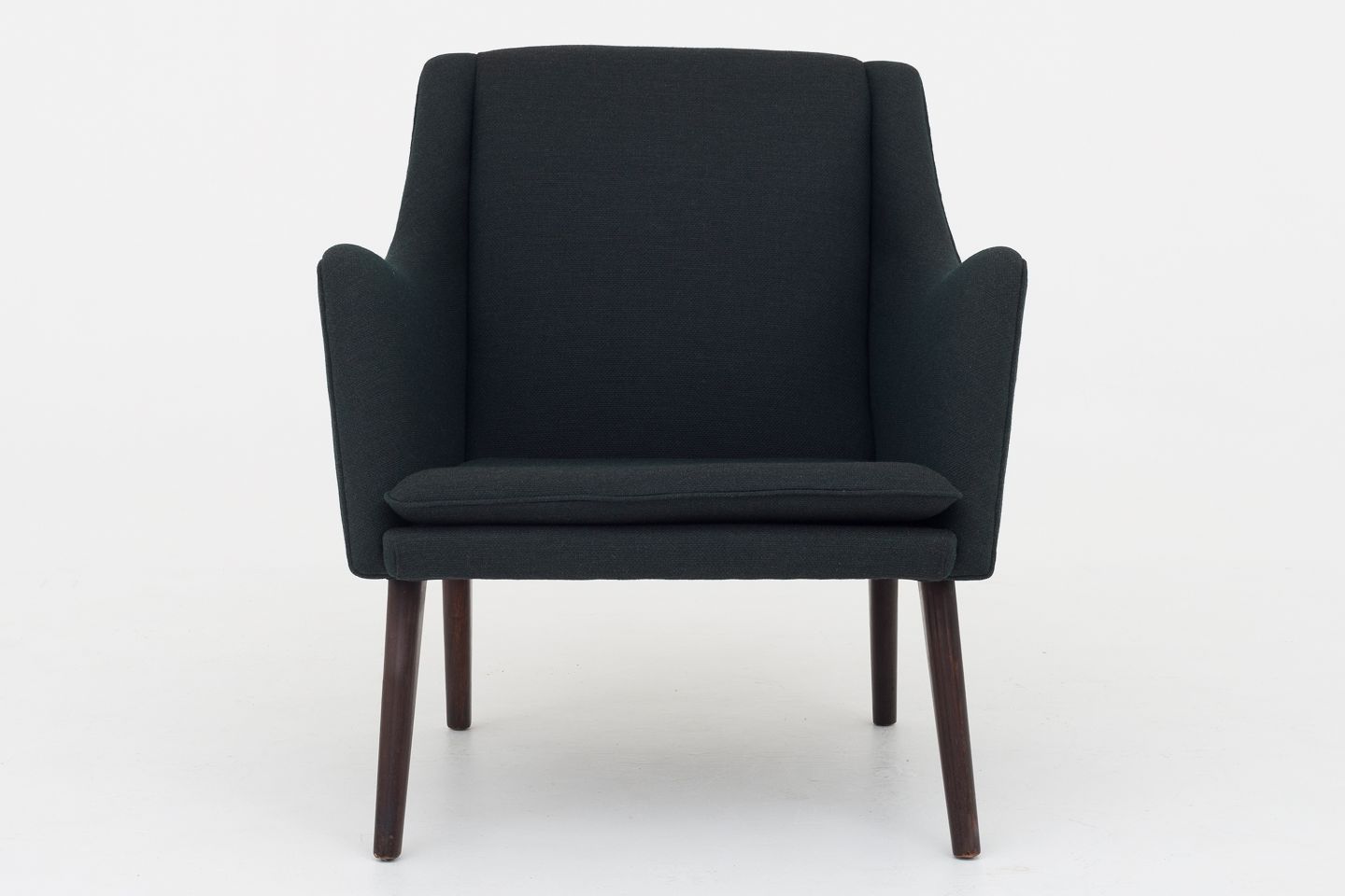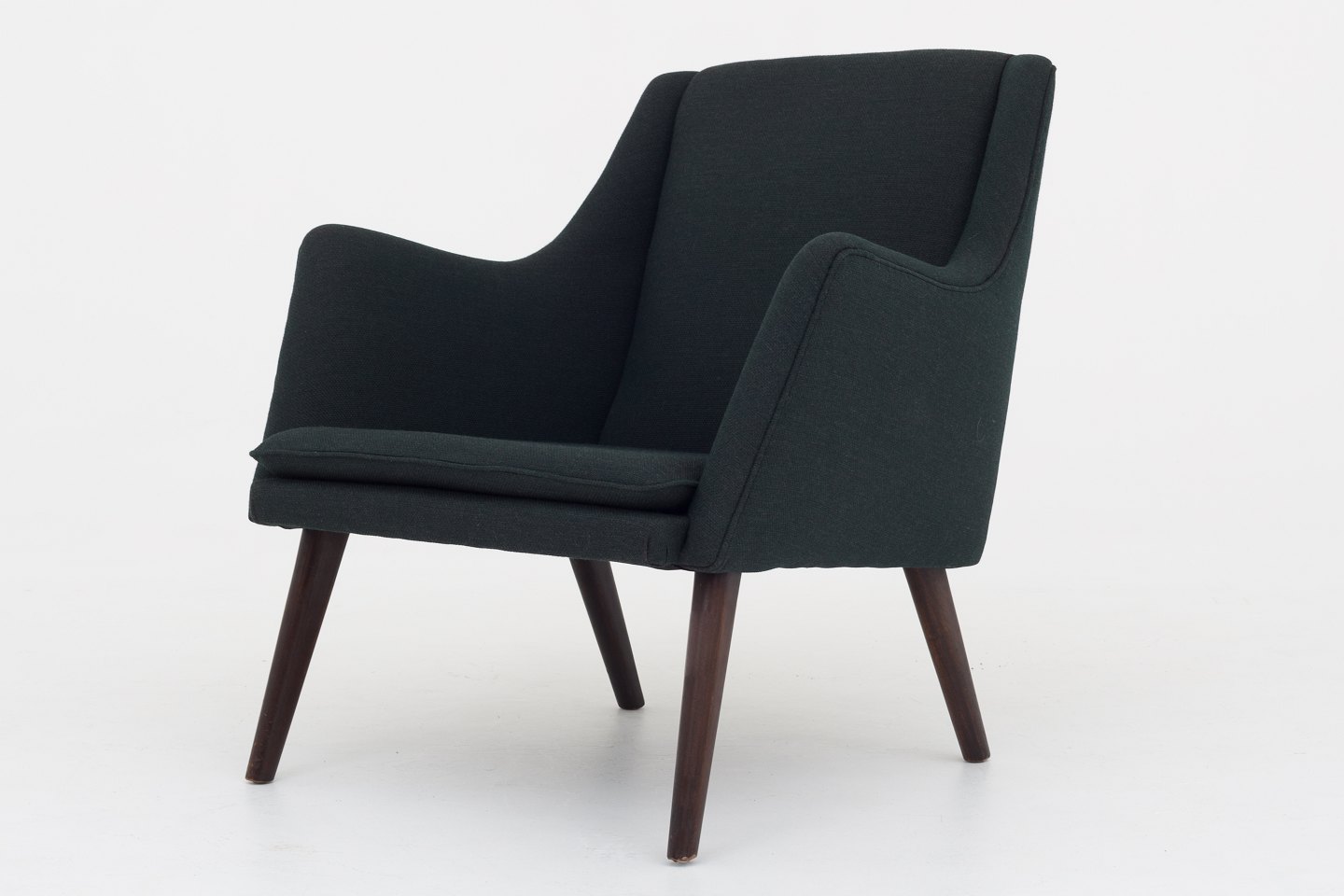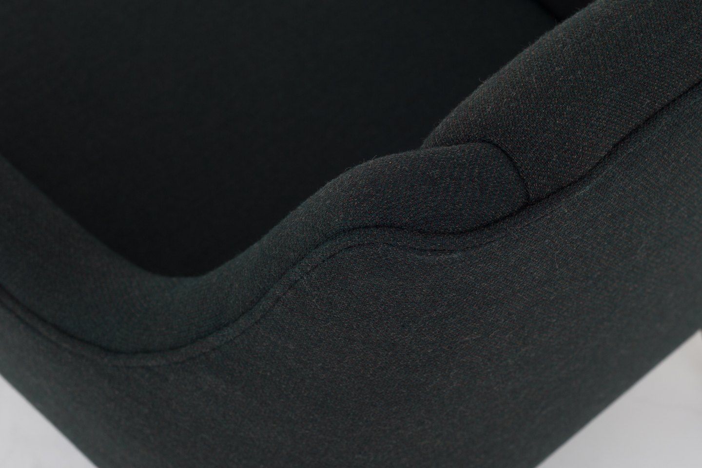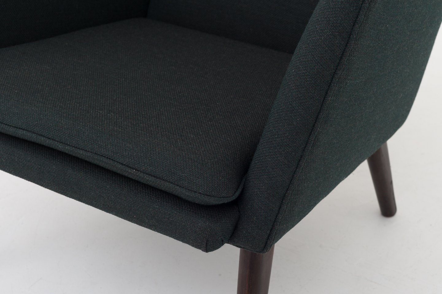 Nybetrukket lænestol i mørkegrønt uld (Fiord col. 991) med bejdsede ben