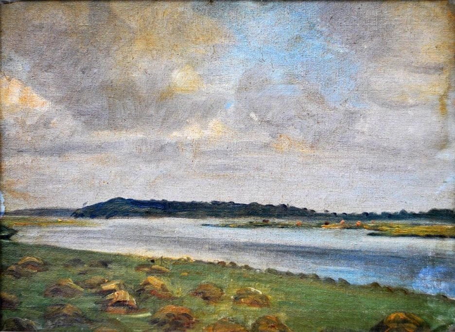 Fischer, Vilhelm Theodor (1857 - 1928) Danmark: Et å løb. Skitse. Olie på lærred/opklæbet på pap. Usigneret. 30 x 40 cm.
