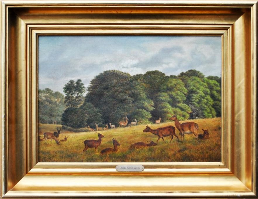 Schovelin, Axel (1827 - 1893) Danmark. Dyr i Dyrehaven. Olie på lærred. Signeret 1875. 26 x 38 cm.