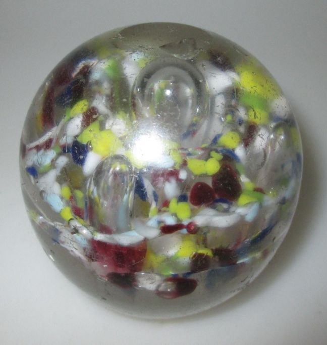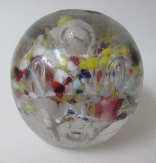 Letter weight, 19th century. Denmark. Clear glass inlaid with multicolored glass and air bubbles. Height: 7.5 cm. Slide: 7.5 cm.