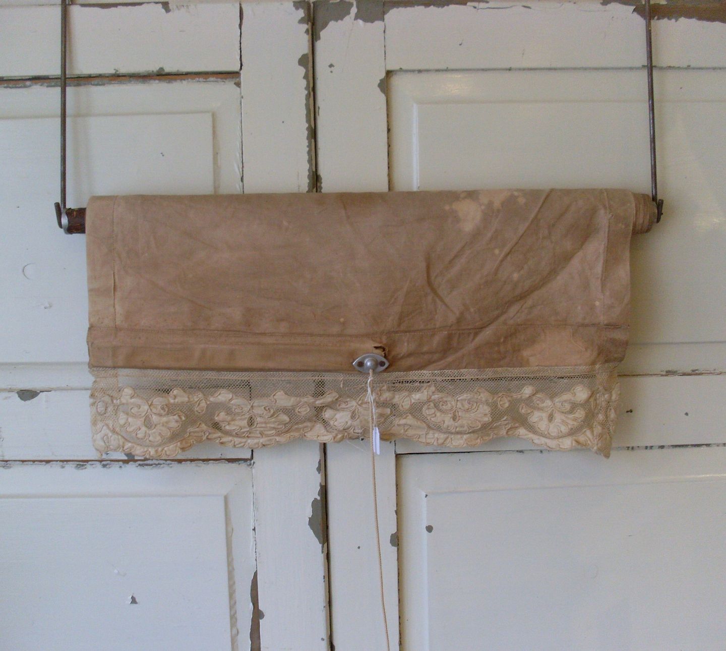 Gammelt smalt vintage rullegardin med hæklet kant.