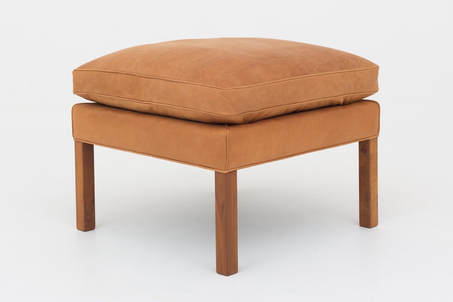 BM 2202 - Nybetrukket skammel i Dunes Cognac-læder med ben i teak. KLASSIK tilbyder polstring af skamlen med stof eller læder efter eget ønske