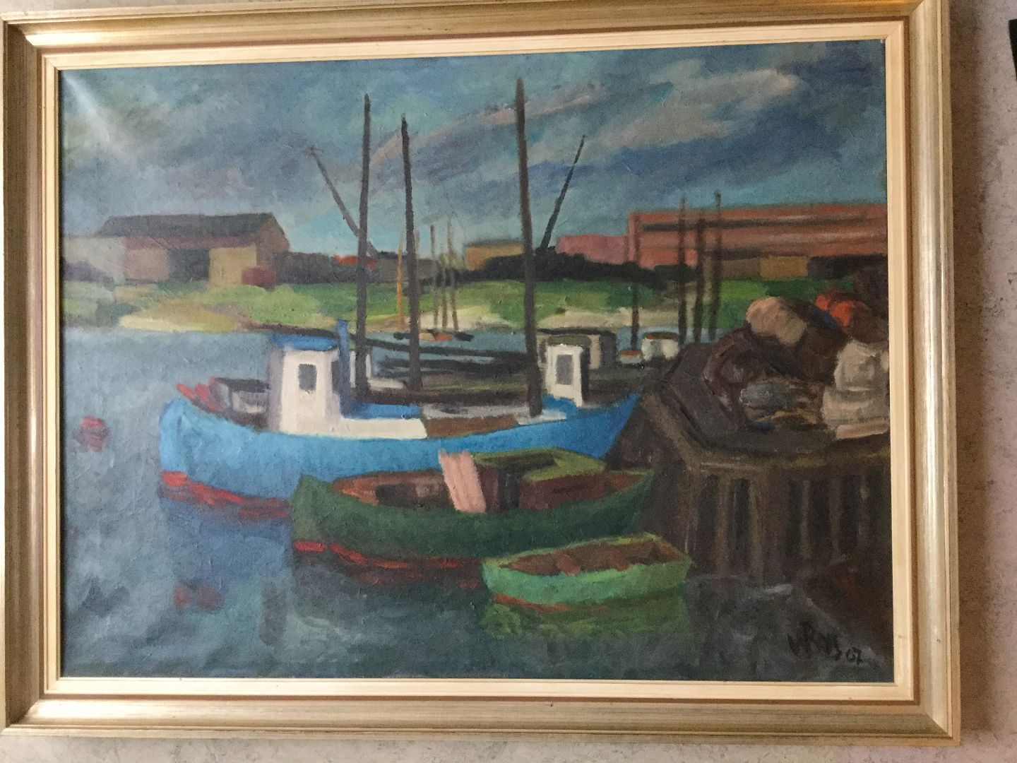 Maleri af William Rasmussen 1967 - Havneparti med både.