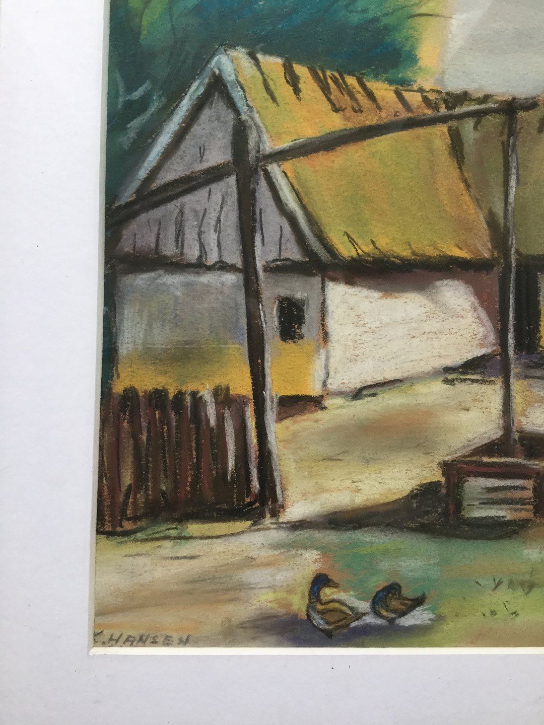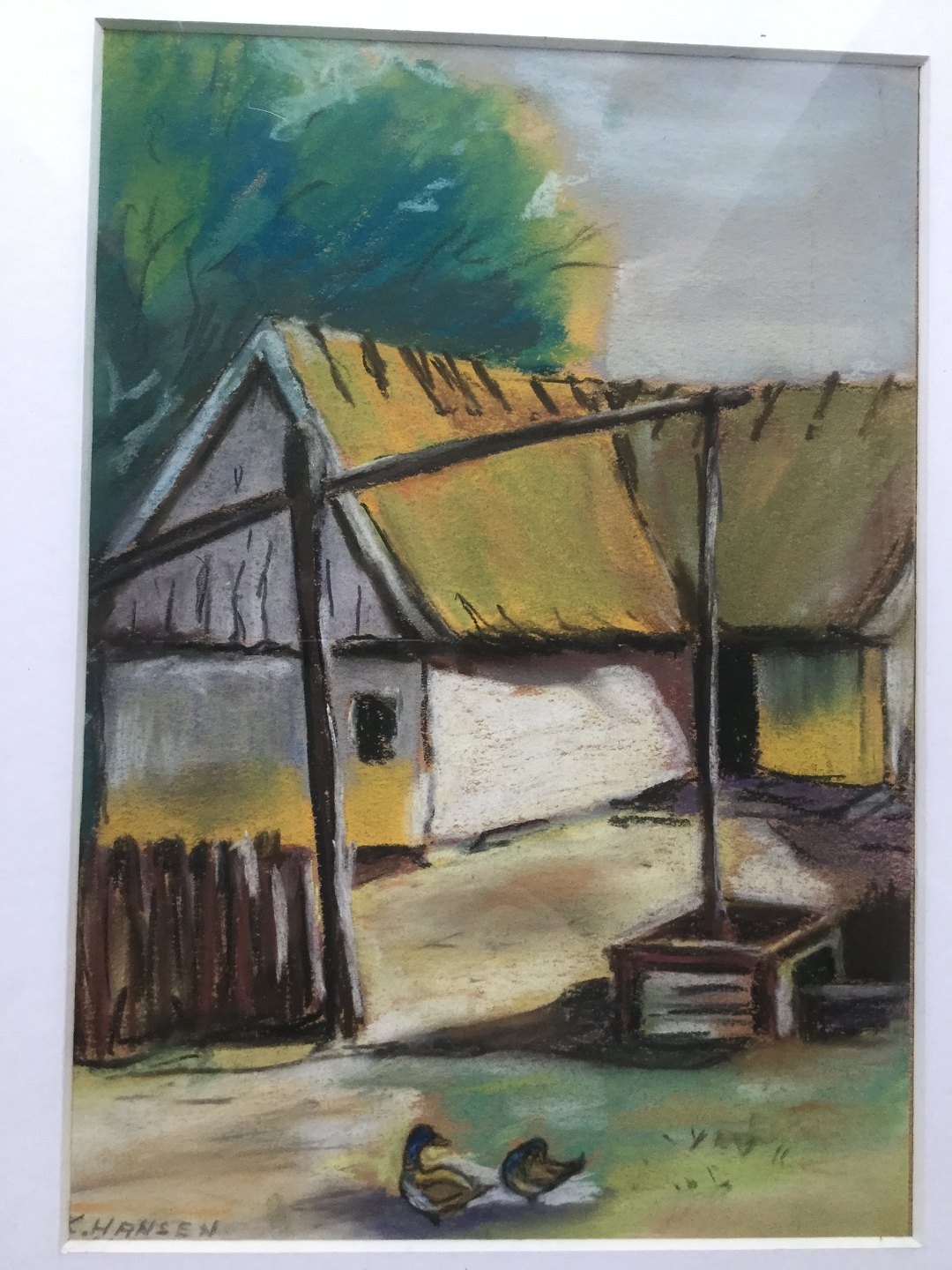 Text available in Danish: Pastel af K. Hansen 1960 - Gårdeksteriør med vandpumpe og ænder.