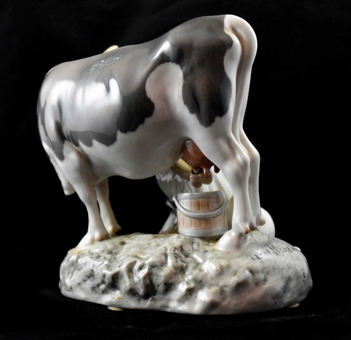 Bing & Grøndahl, Malkepige i blå kjole, der malker sortbroget ko. Lille hvid kat se på. no. 2017,