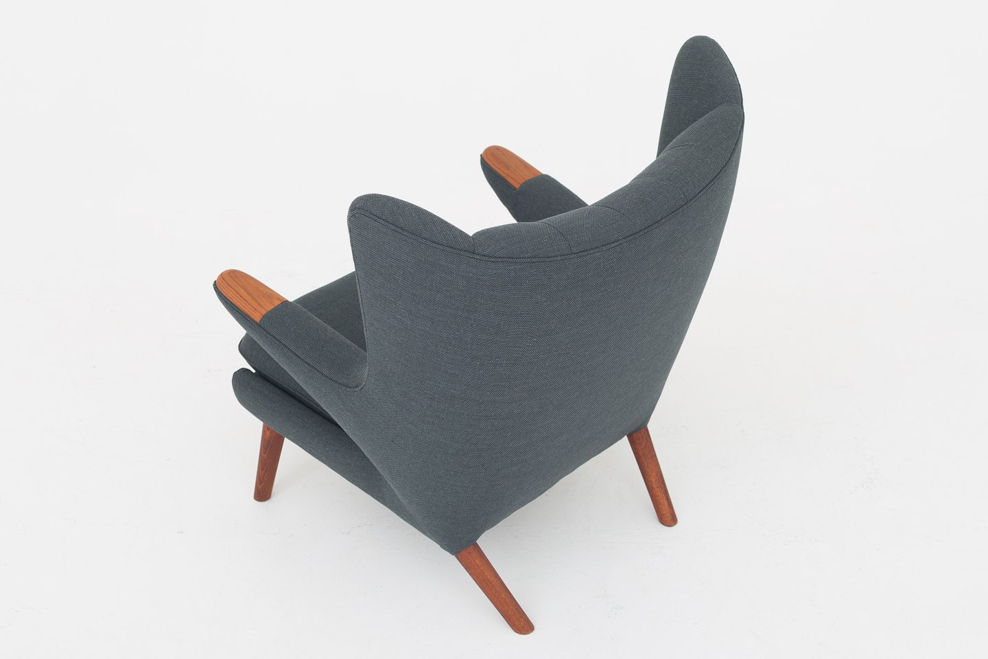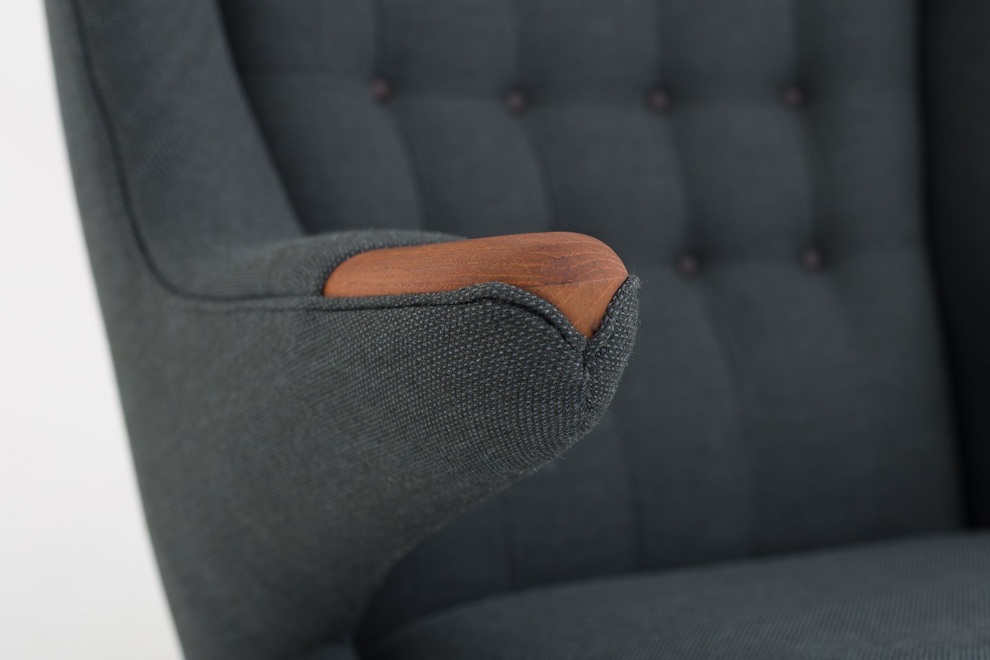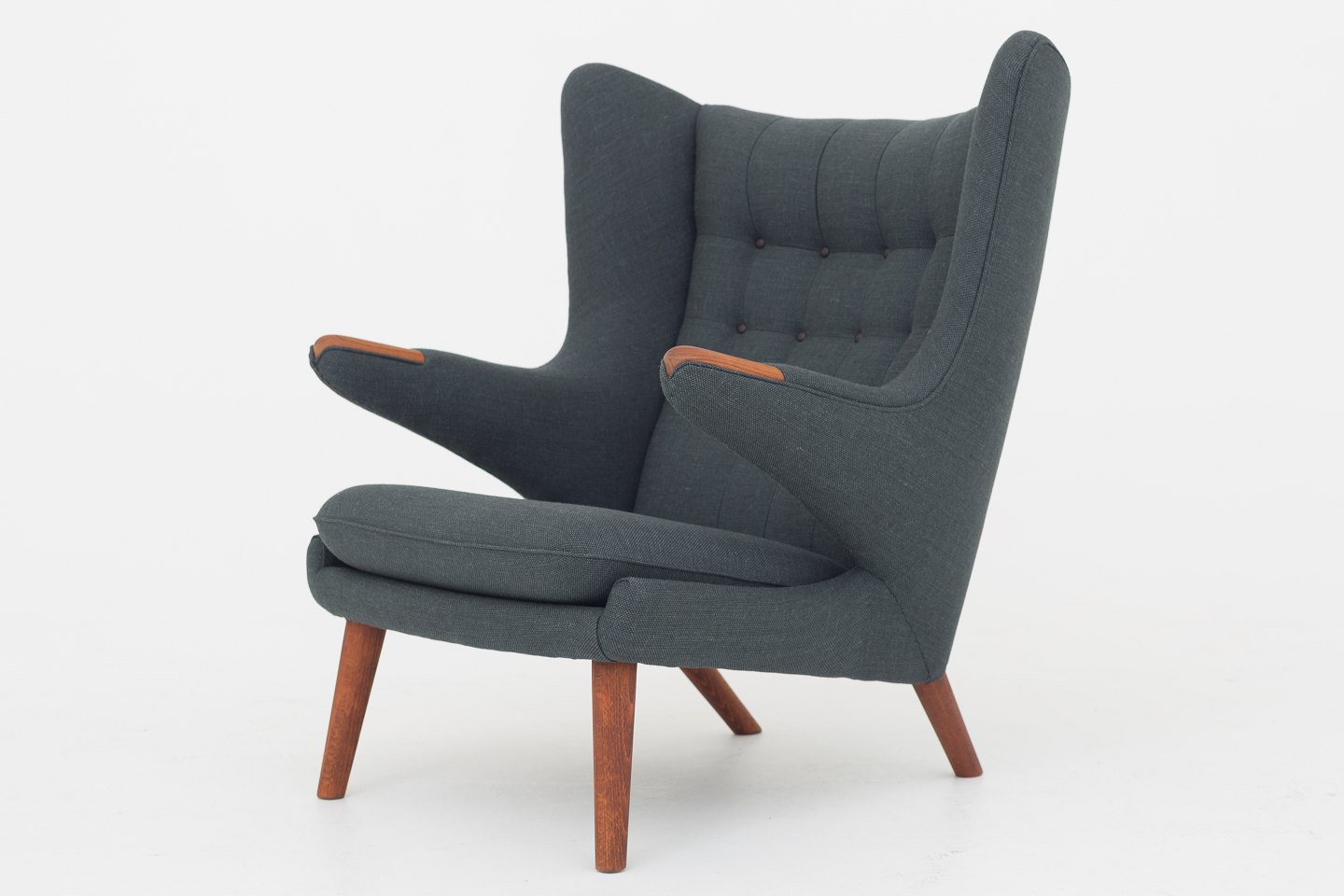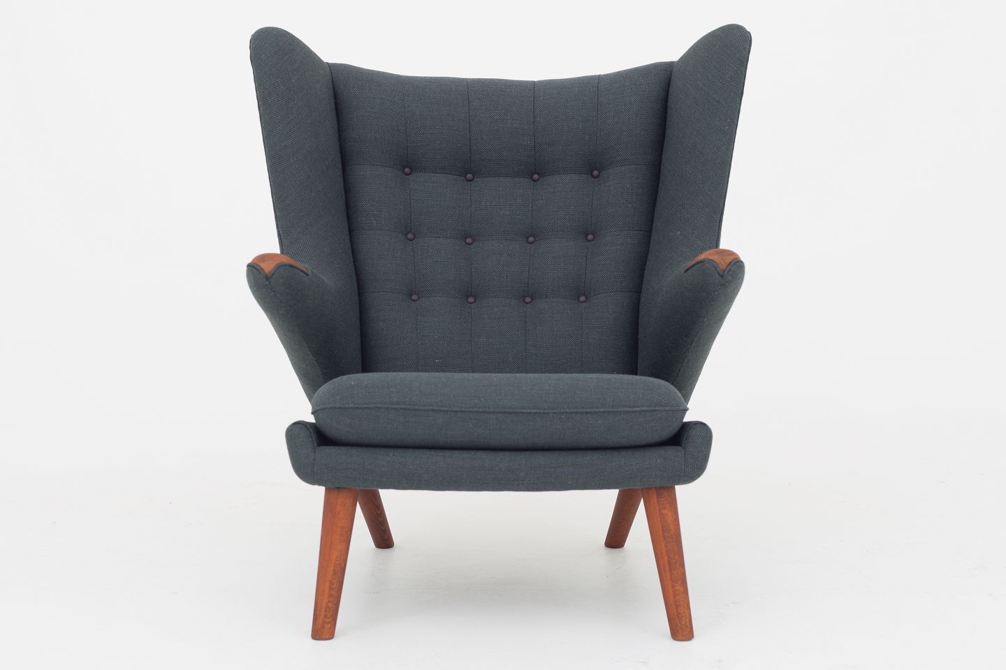 AP 19 - Nybetrukket Bamsestol i Clara 2-stof (code: 987) med knapper i Savanne-læder (farve: Coffee). Poter i teak og ben i eg