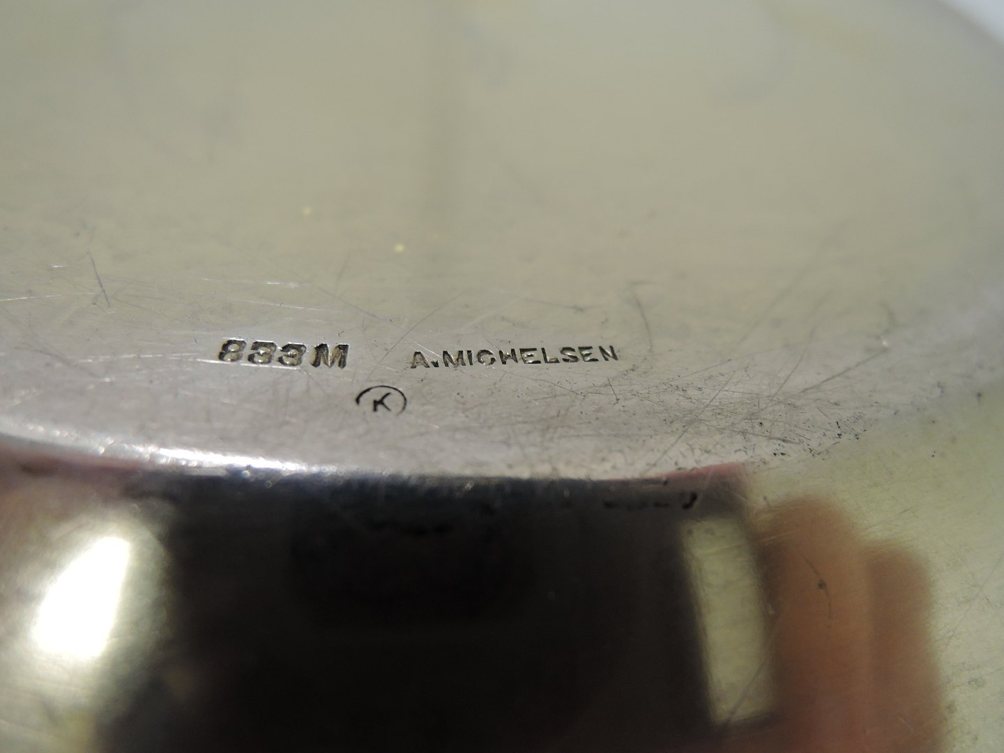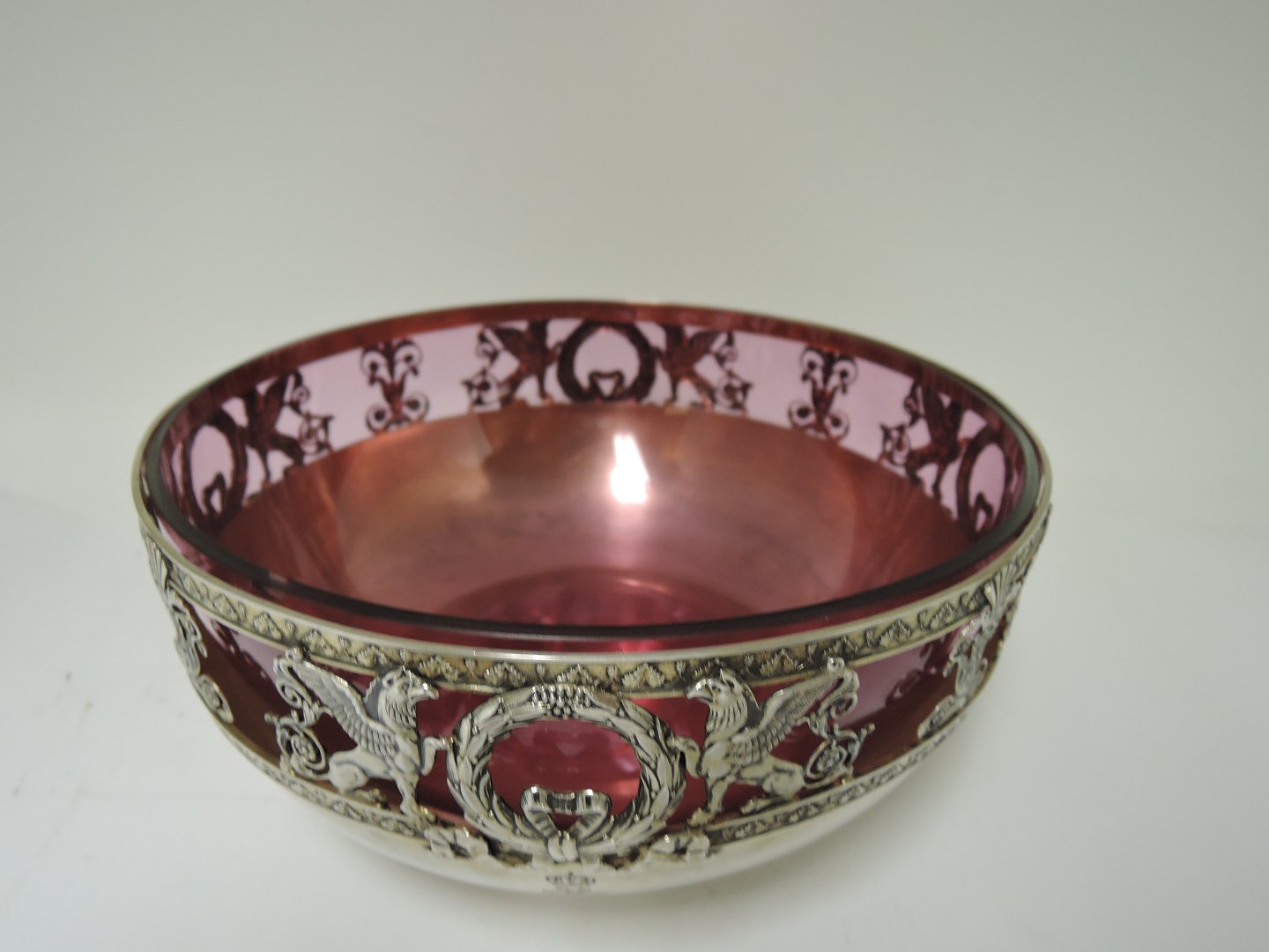A. Michelsen. Sølv (833). Rund sølvskål med rød glasindsats. Diameter 20 cm. Med gravering Kronet HH. (Prins Harald & Prinsesse Helene )