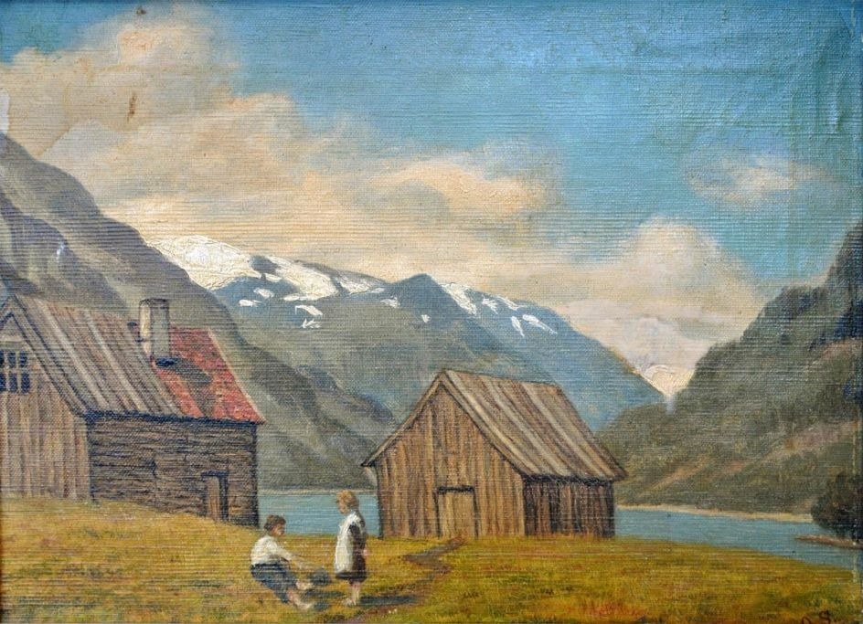 Schütte, Oscar (1837 - 1913) Danmark. To legende børn. Norge. Olie på lærred. Signeret.: O.S. 28 x 38 cm.