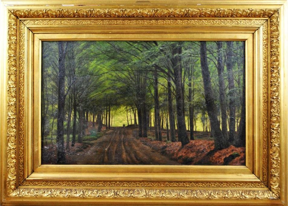 Groth, Vilhelm (1842 - 1899) Danmark. Personer på en vej i en skov - forår. Olie på lærred. Sign.: Vilh Groth 84. 35 x 68 cm.