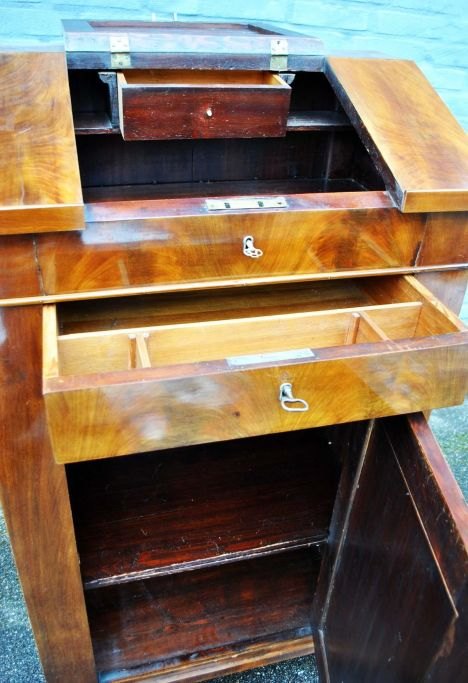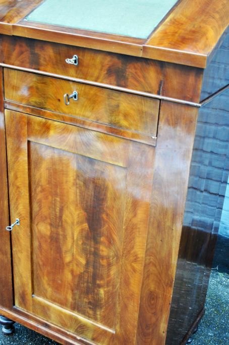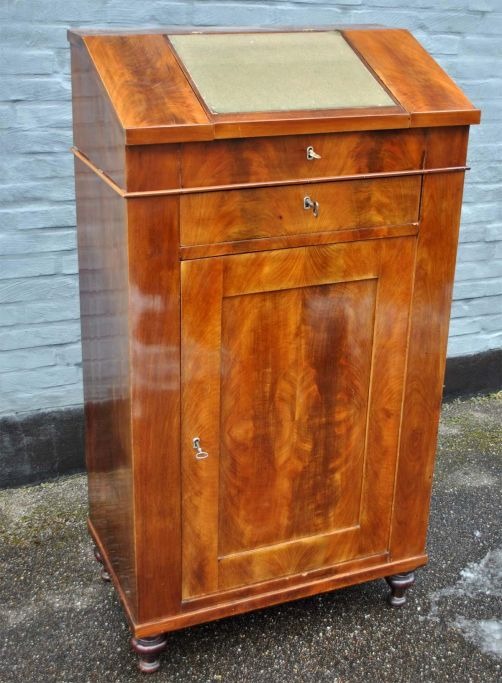 Håndpoleret dansk empire skrivepult i mahogni, 1820 - 40. Øverst skrivepult med filt underlag, under lågen, rum med skuffe. Nedenfor skuffe med mindre rum. Nederst skab med hylder. H.: 140 cm. B.: 74 cm. D.45 cm. Nøgler medfølger