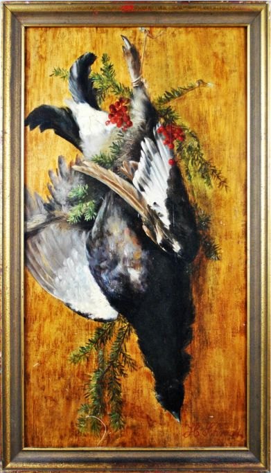 Ubekendt kunstner (19. årh) En ophængt urfugl. Signeret.: H. Schrodt. Olie på træ. 65 x 35 cm.