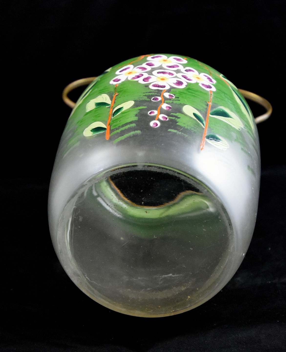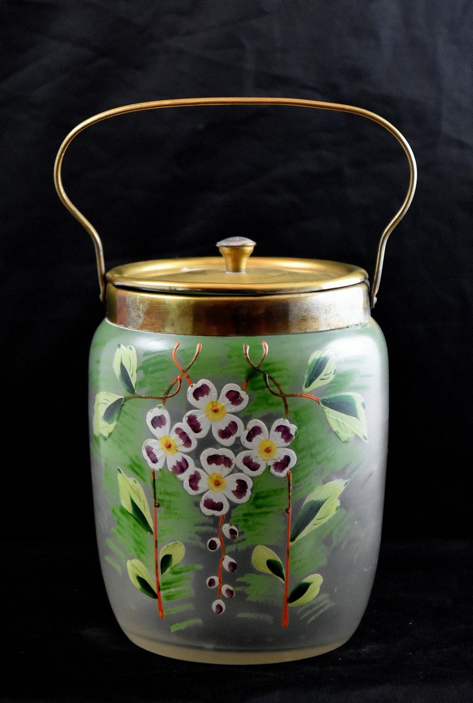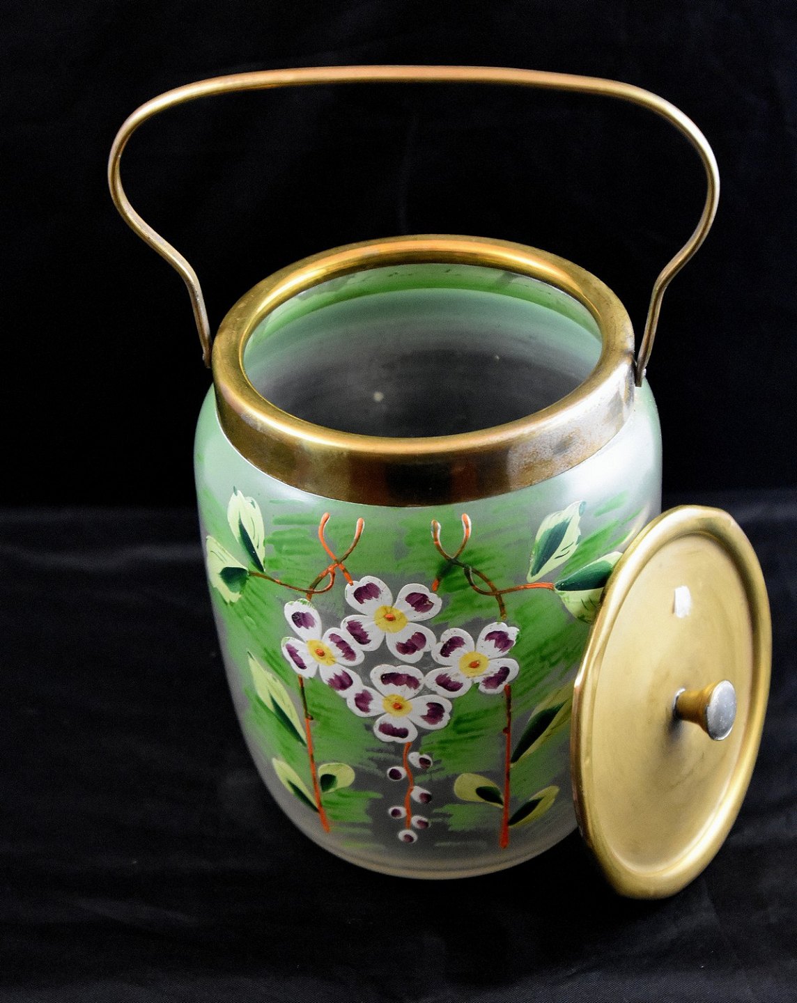 Glas kiksespand med grøn bemaling og hvid og lilla blomster. Hank og låg er af messing
