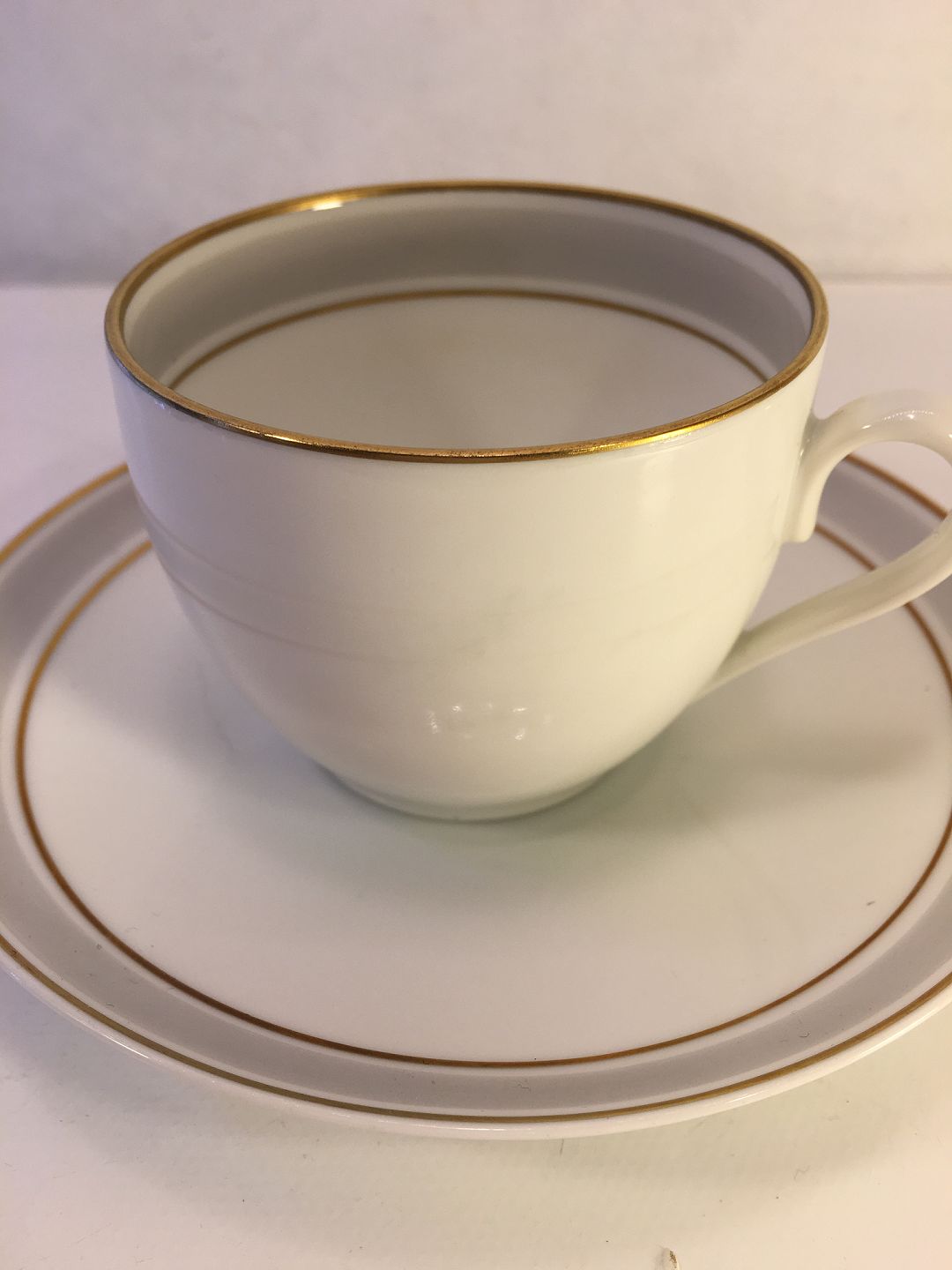 Tiber Coffee Cup and Saucer White with Light Gray Table and Gold Edge.