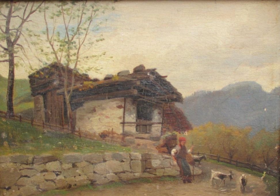 Dansk kunstner (19. årh.): En hyrde i bjergene, Italien. Olie på mahogni. Usigneret. 13,5 x 19 cm.