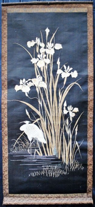 Japanese embroidery with trane, approx. 1900. On paper roll. 125 x 56 cm.