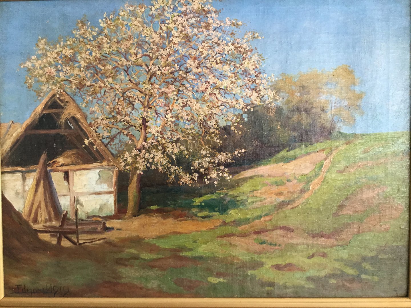 Maleri Edmund Petersen - Gammel faldefærdig gård med blomstrende frugttræ 1919.