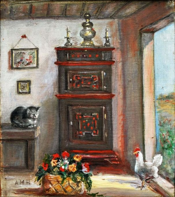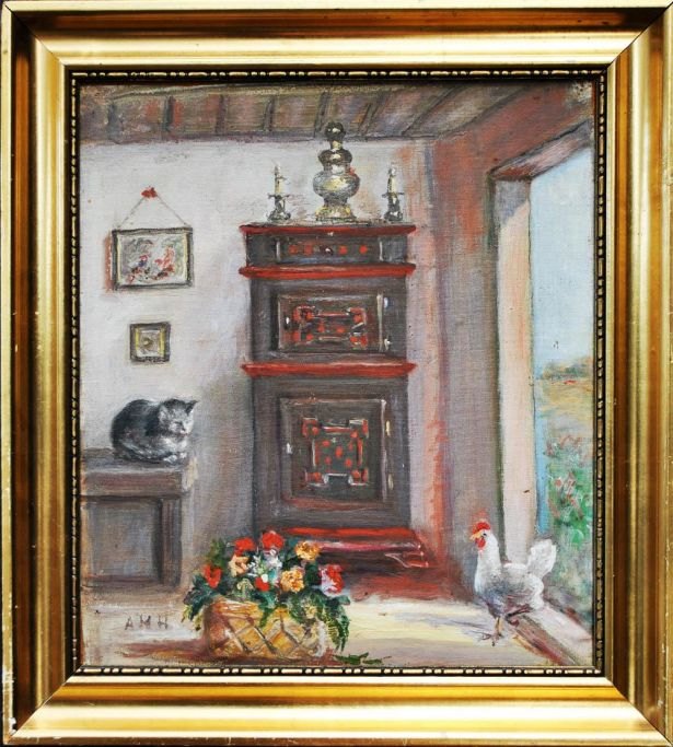 Hansen, Ane Marie (1852 - 1941) Danmark: Bonde interiør med kat og hane. Olie på lærred/pap. Signeret.: A.M.H. 34 x 30 cm.