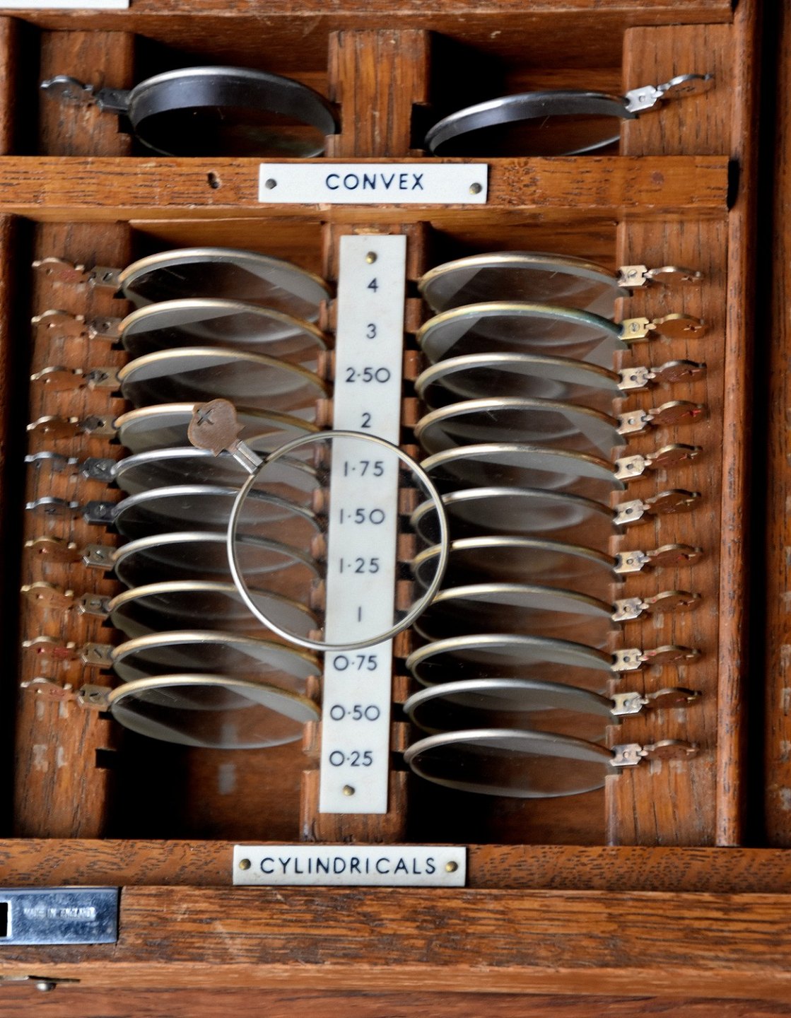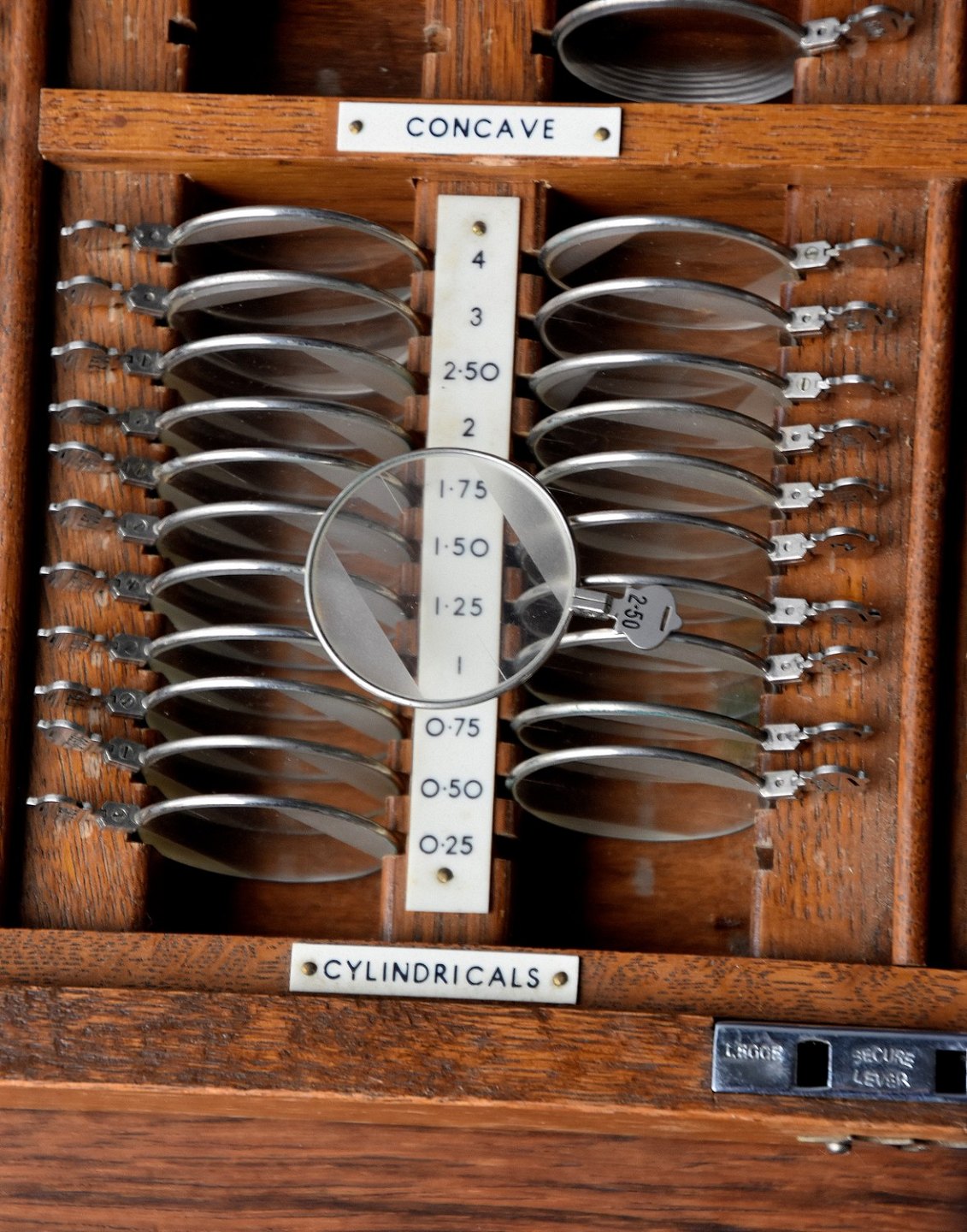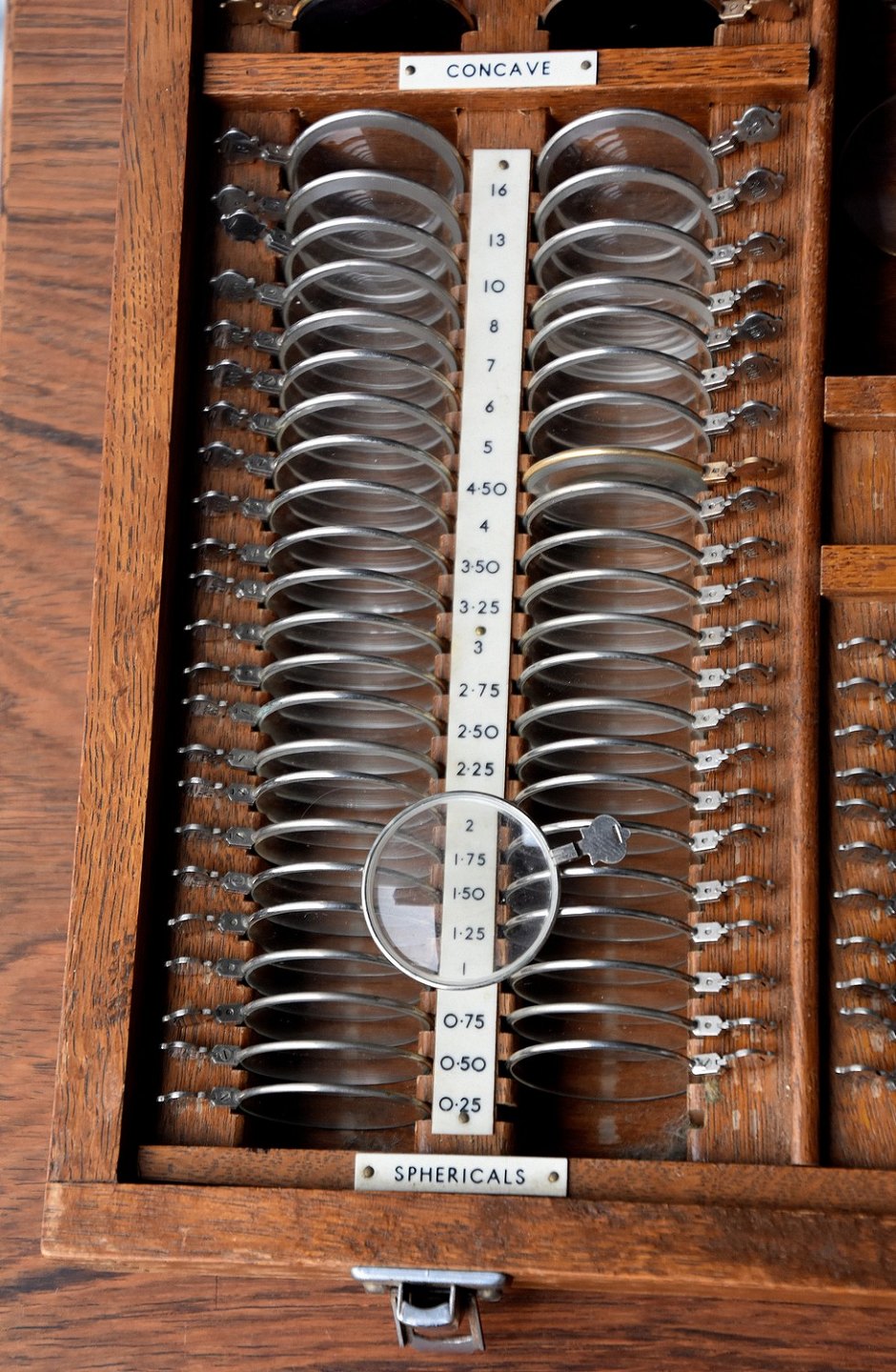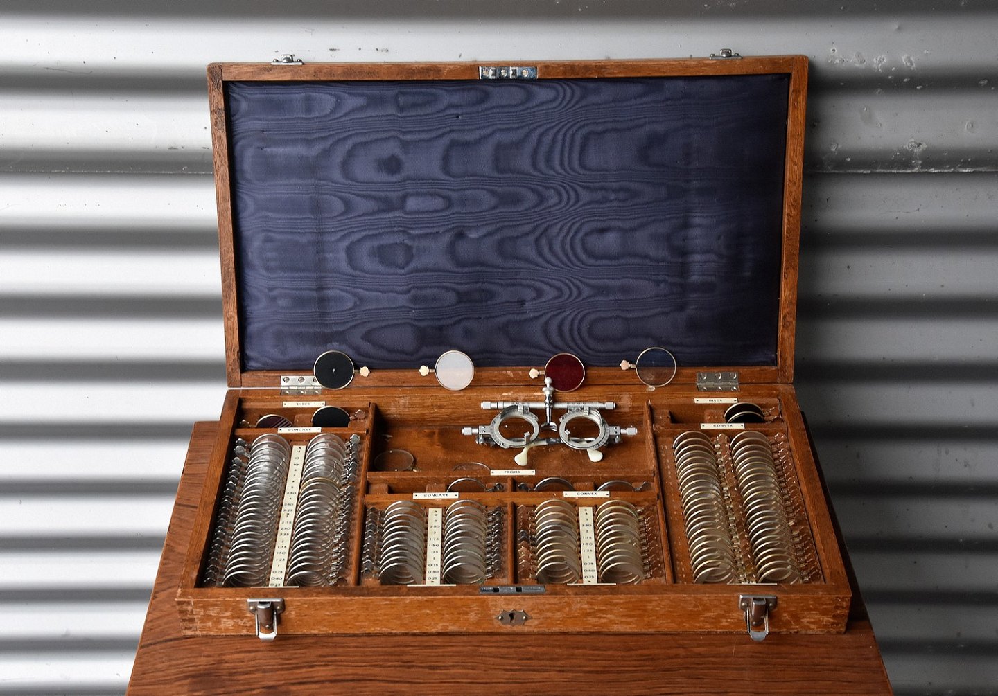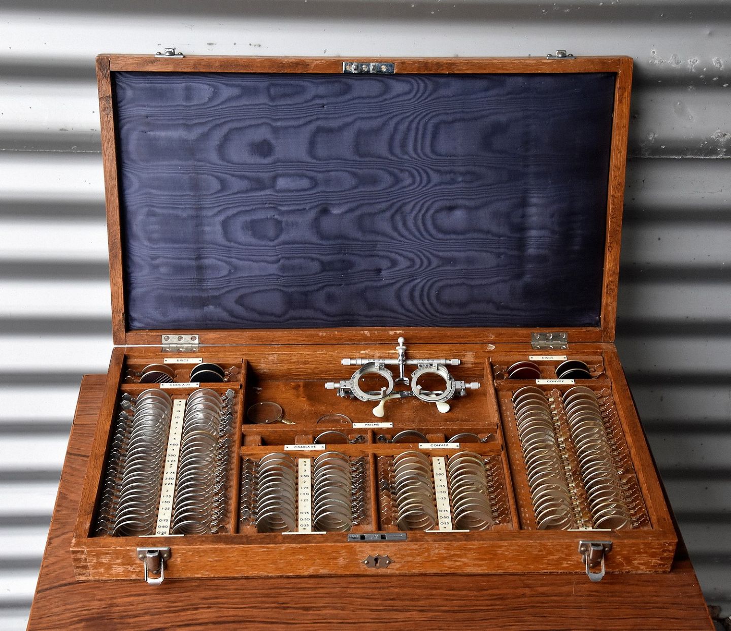 Optikersæt i tilhørende kuffert indeholder diverse linser samt et stel til linserne
