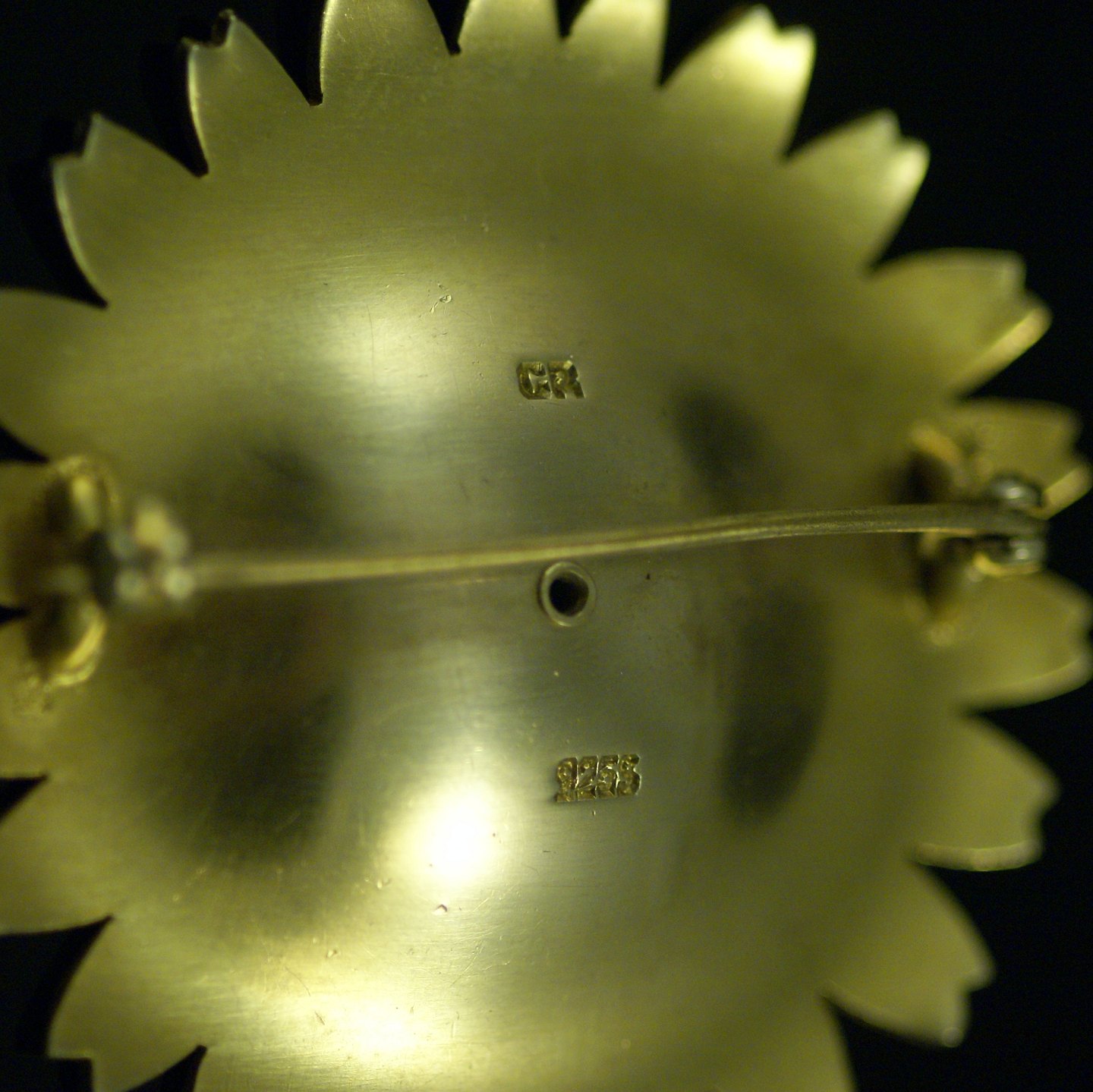 Chr. Rasmussen Marguerit Broche i forgyldt Sterling Sølv med blå emalje. 50mm