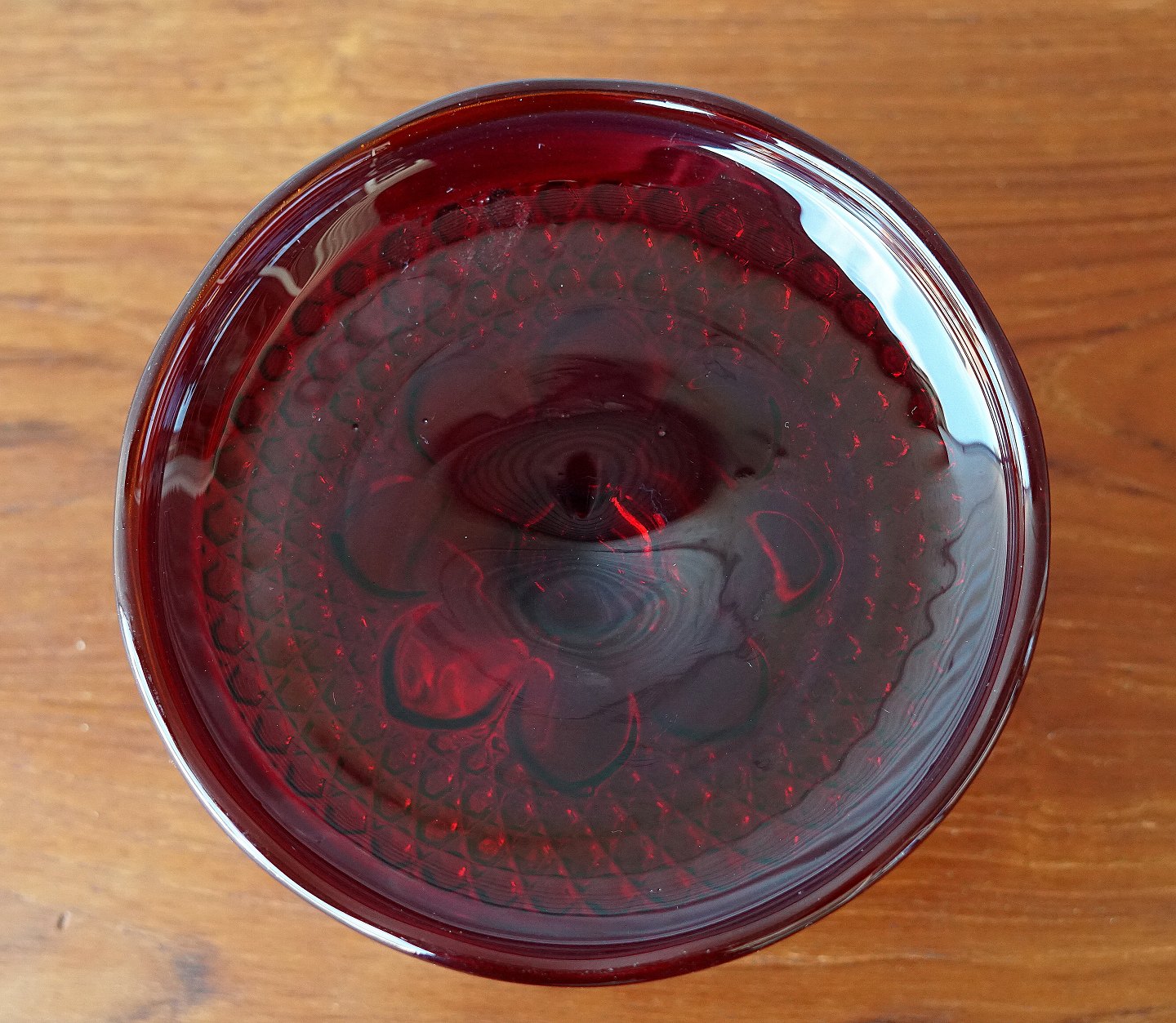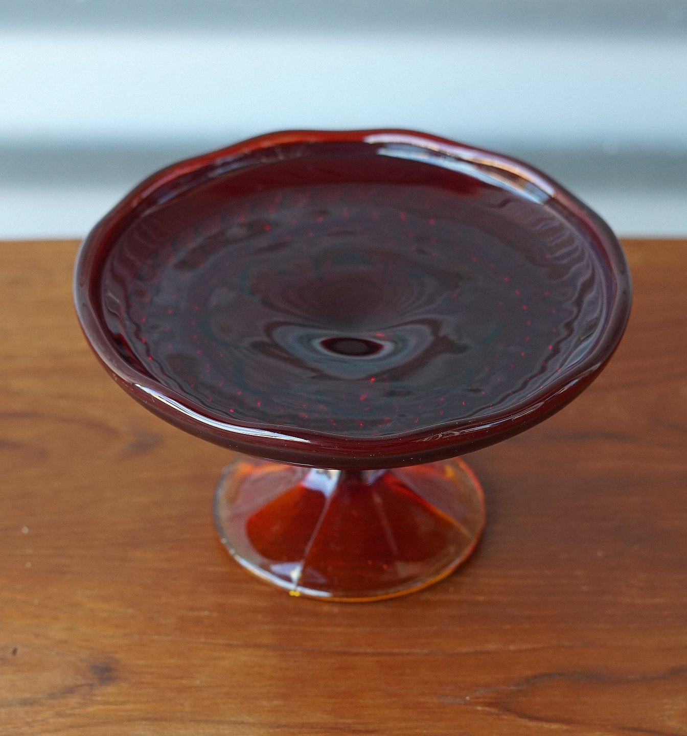 Rød og gul glas opsats fra Fyens Glasværk. Opsatsens skål er rød og farverne fader ud til gul, så foden er gul.