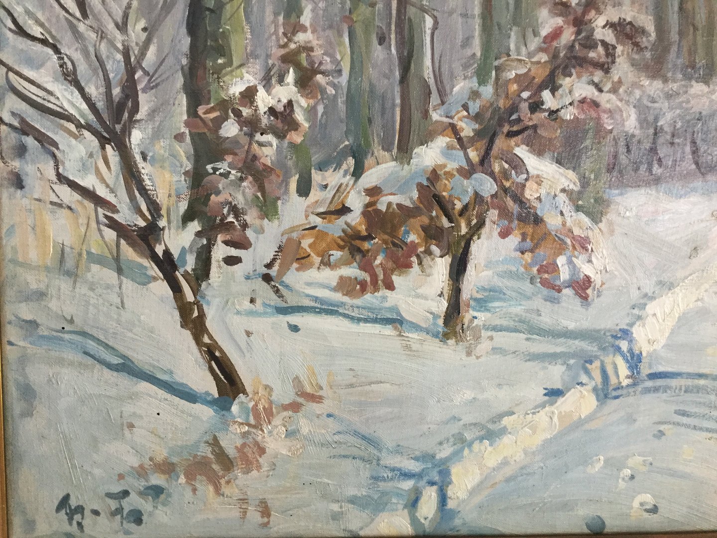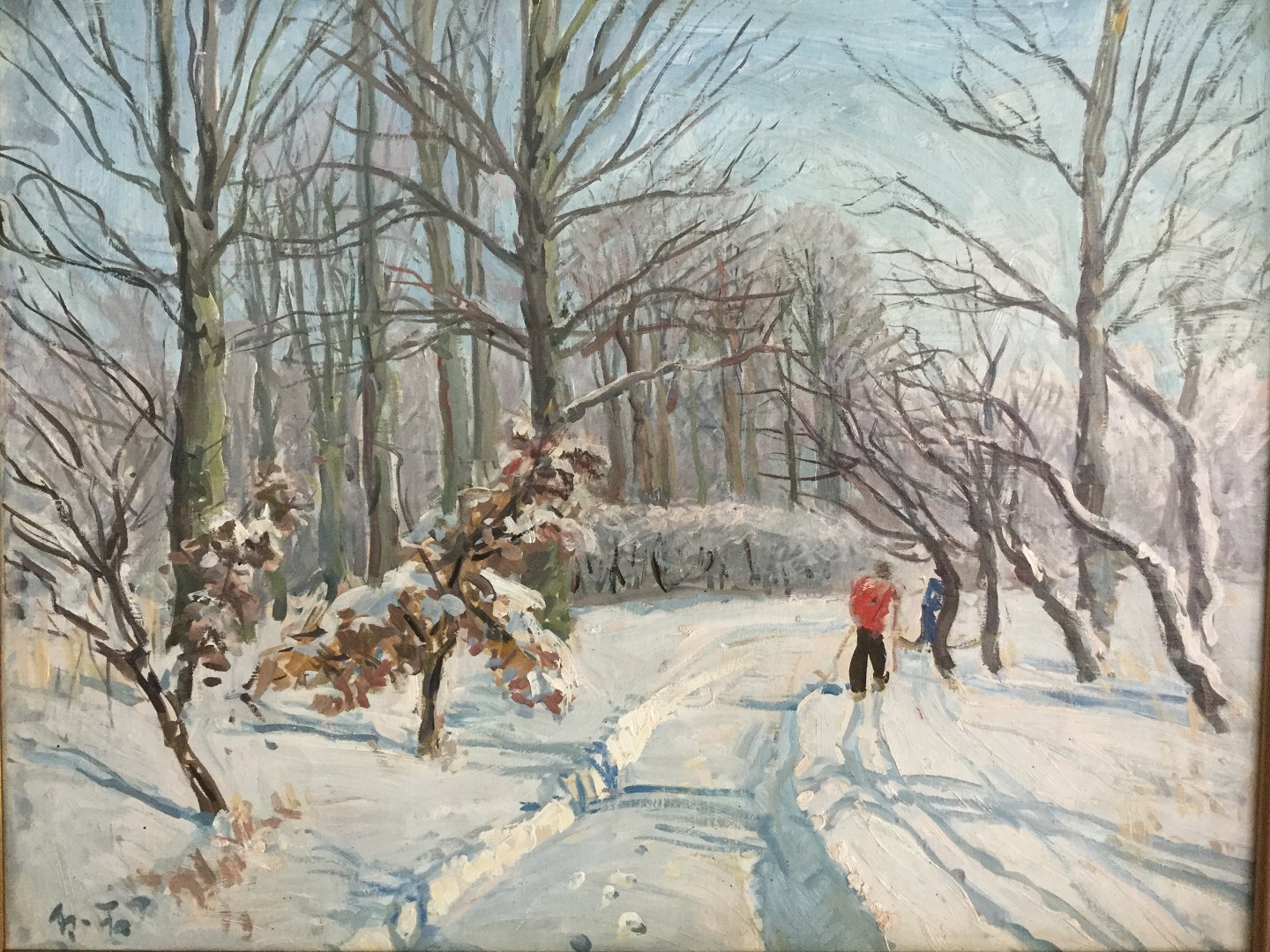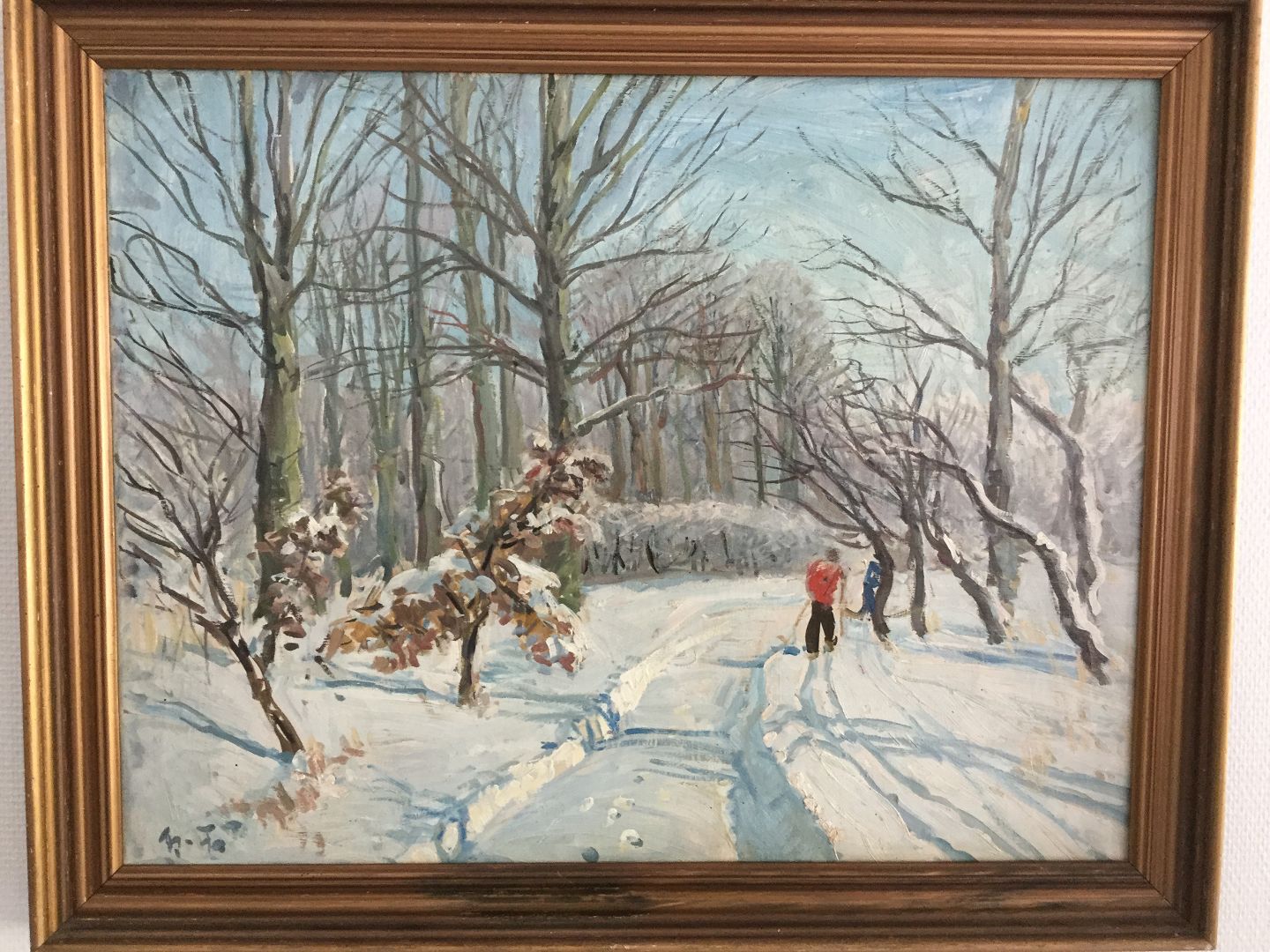 Maleri af Aage Bernhard-Frederiksen "Vinterparti fra skov med skiløbere"