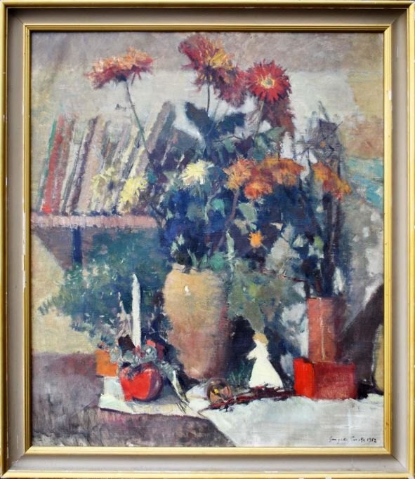 Godycki-Cwirko, Dmitri (1908 - 1988) Rusland: Opstilling med blomster, bøger, lys m.v. Olie på lærred. Signeret.: Godycki Cwirko 1952. 80 x 70 cm.
